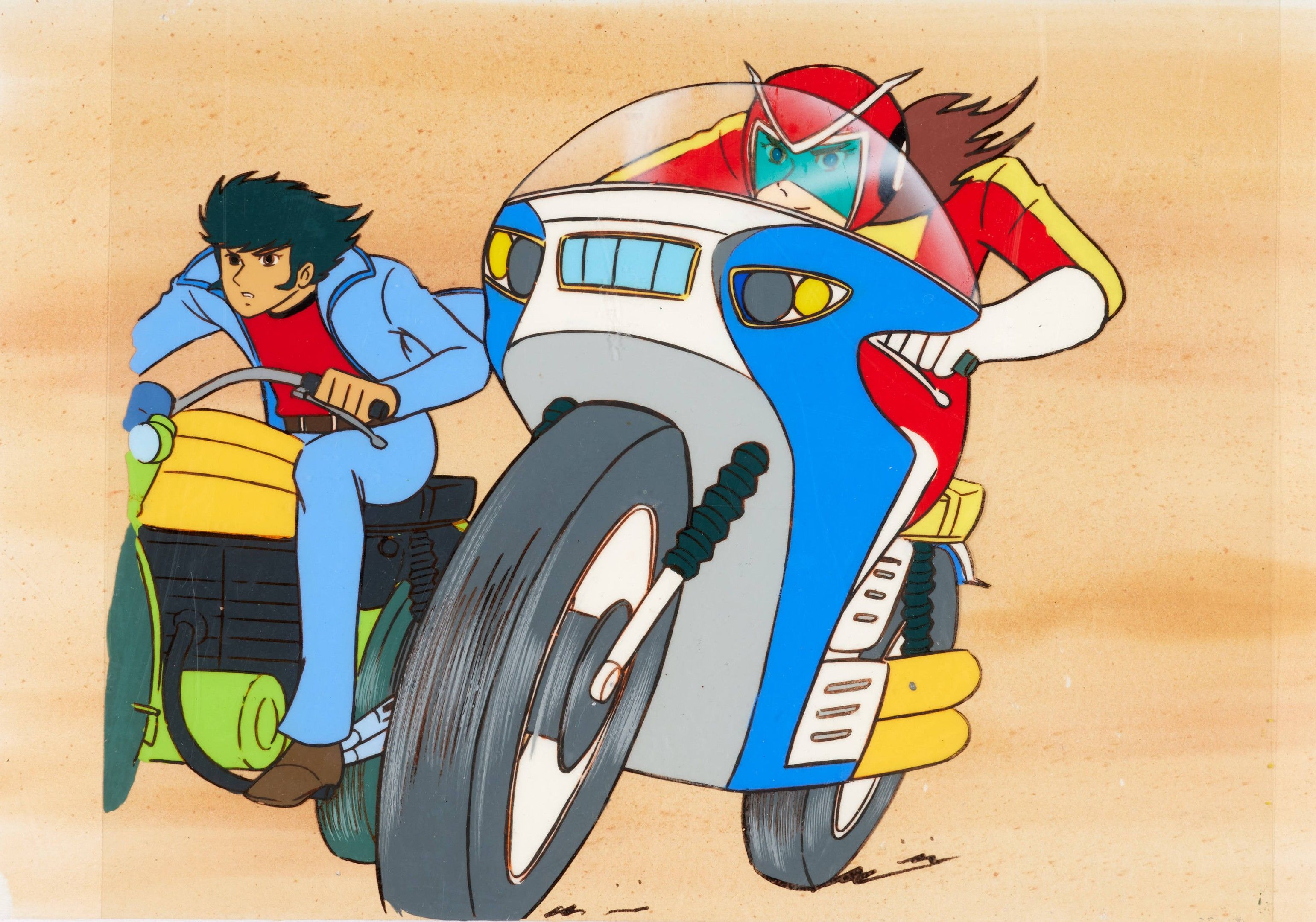 India ink and gouache on celluloid for an illustration showing Alcor and Phénicia on a motorbike. Character design by Kazuo Komatsubara and Shingo Araki. A Toei Animation and Dynamic Planning co-production for Fuji TV, 1975-1977.