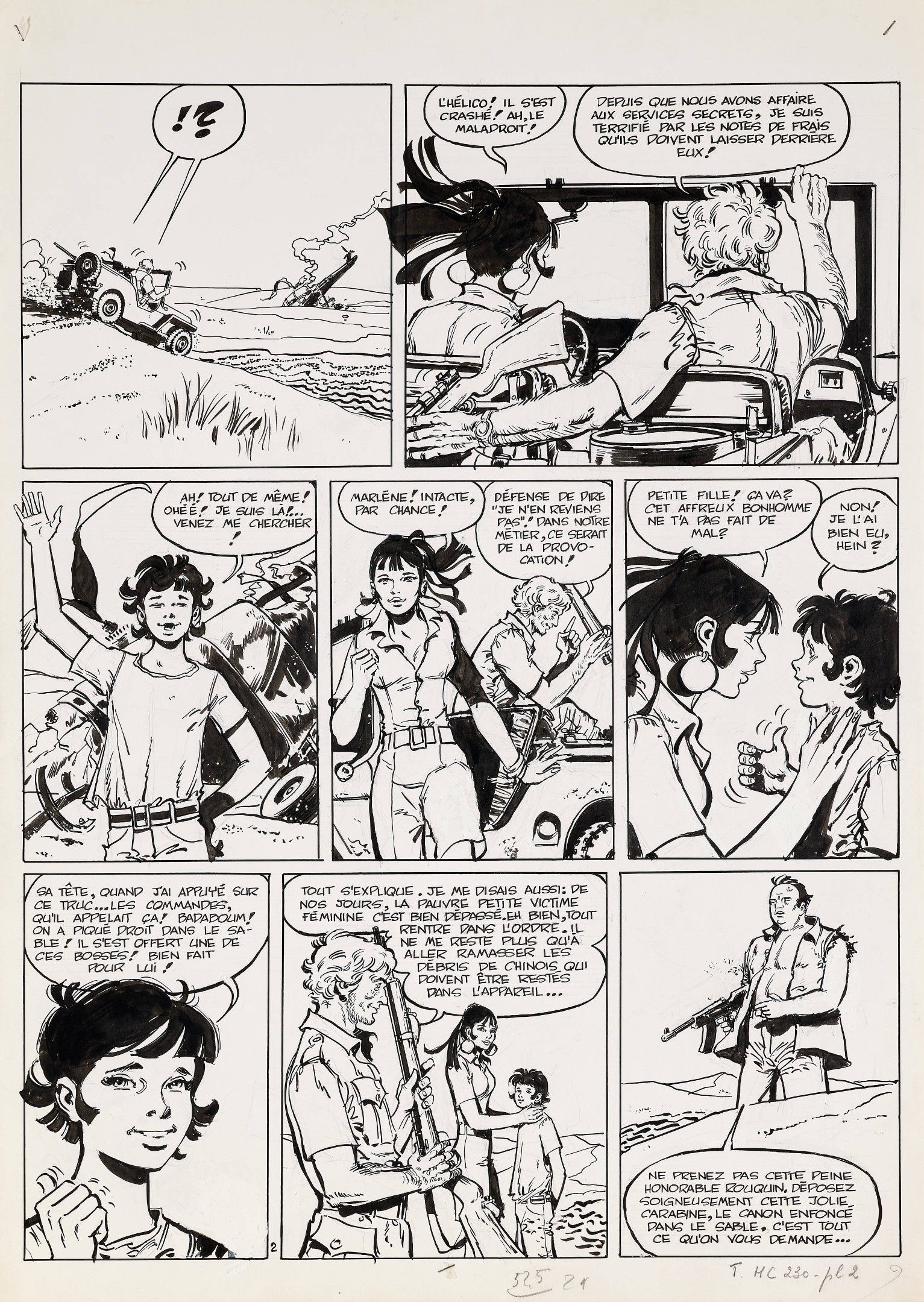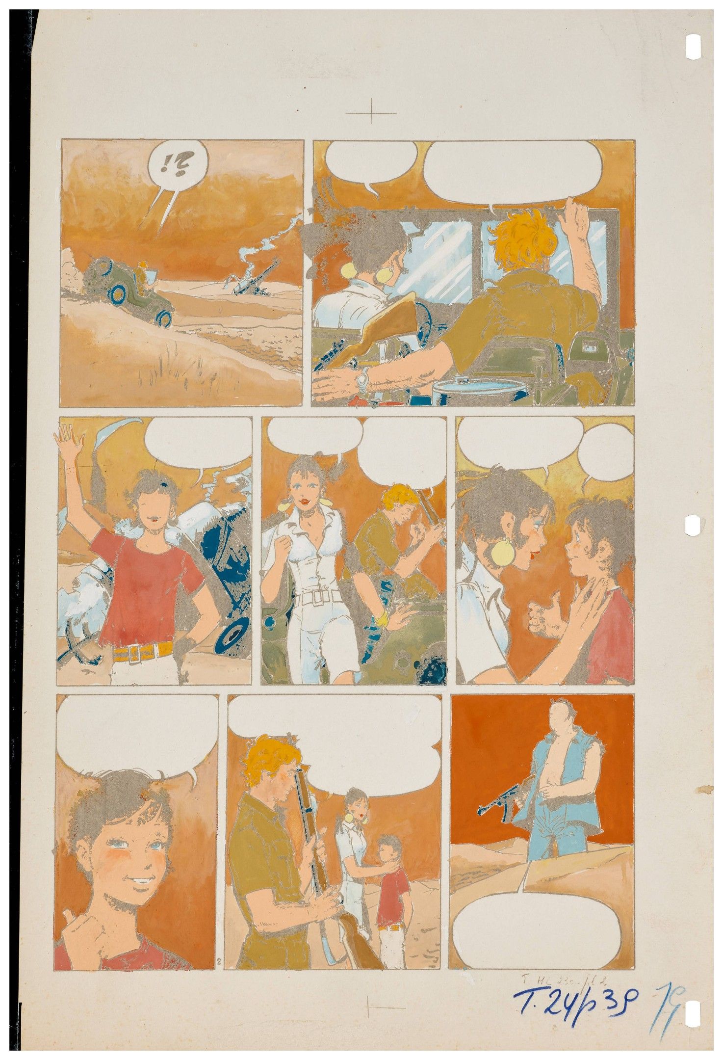 India ink, graphite and gouache on paper for plate 3 of this album published in 1976 by Dargaud. Accompanied by the colouring and lettering in Dutch. Script by Greg. A story from the newspaper Tintin.