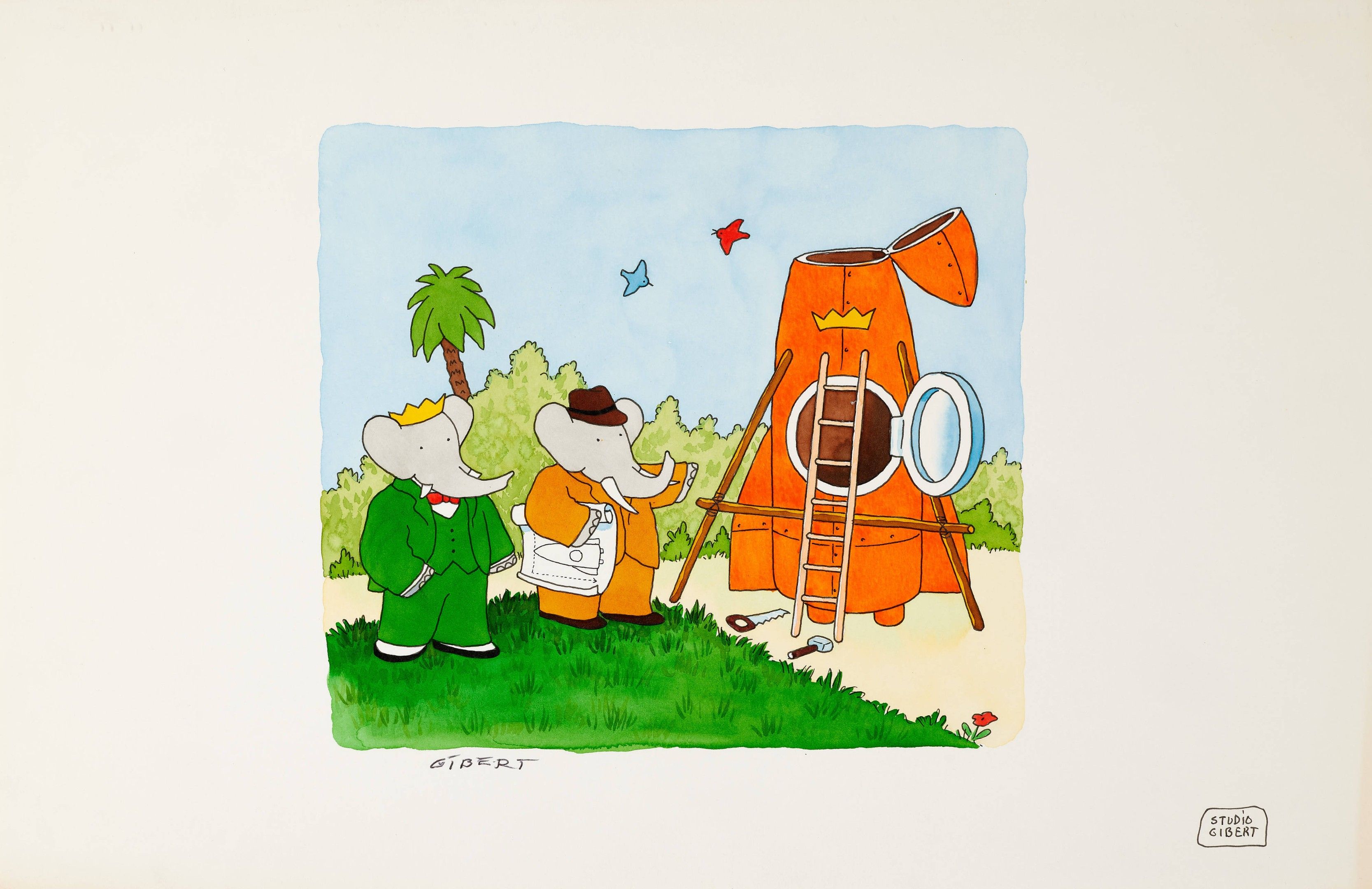 India ink, coloured inks and watercolour on paper for an illustration depicting Babar and the engineer who designed a pretty orange rocket to fly through the sky like the birds.