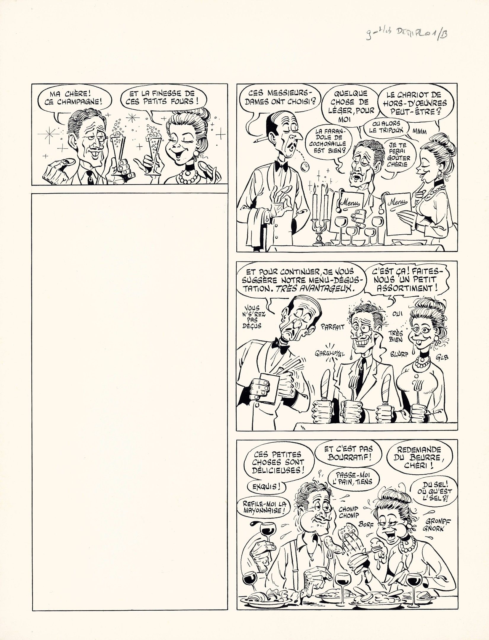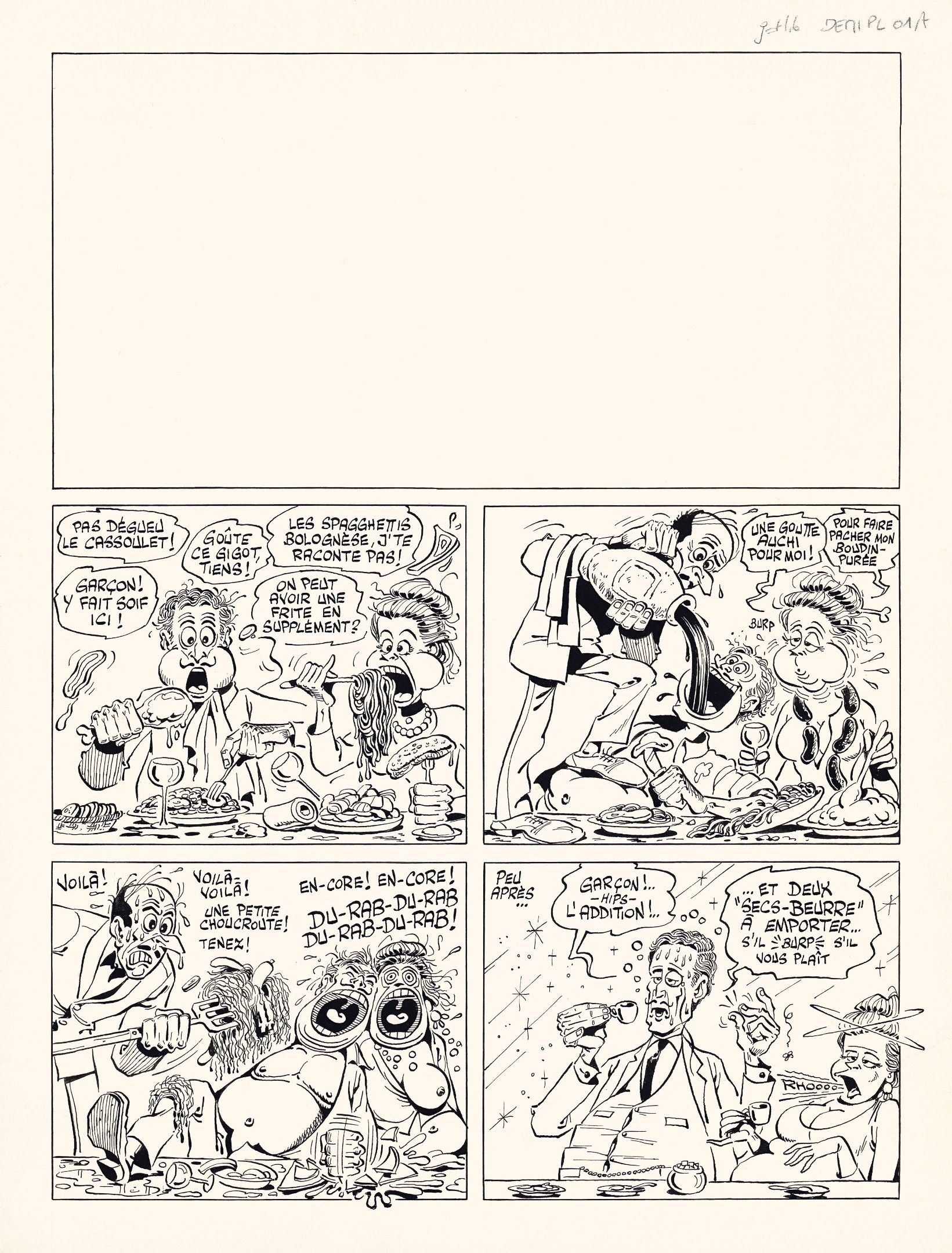 India ink on paper for two plates in this album published in 1988 by Albert René. A chapter devoted to the pleasures of the table. Album designed by Richard Gotainer for the texts, Gotlib and Albert Uderzo for the drawings.