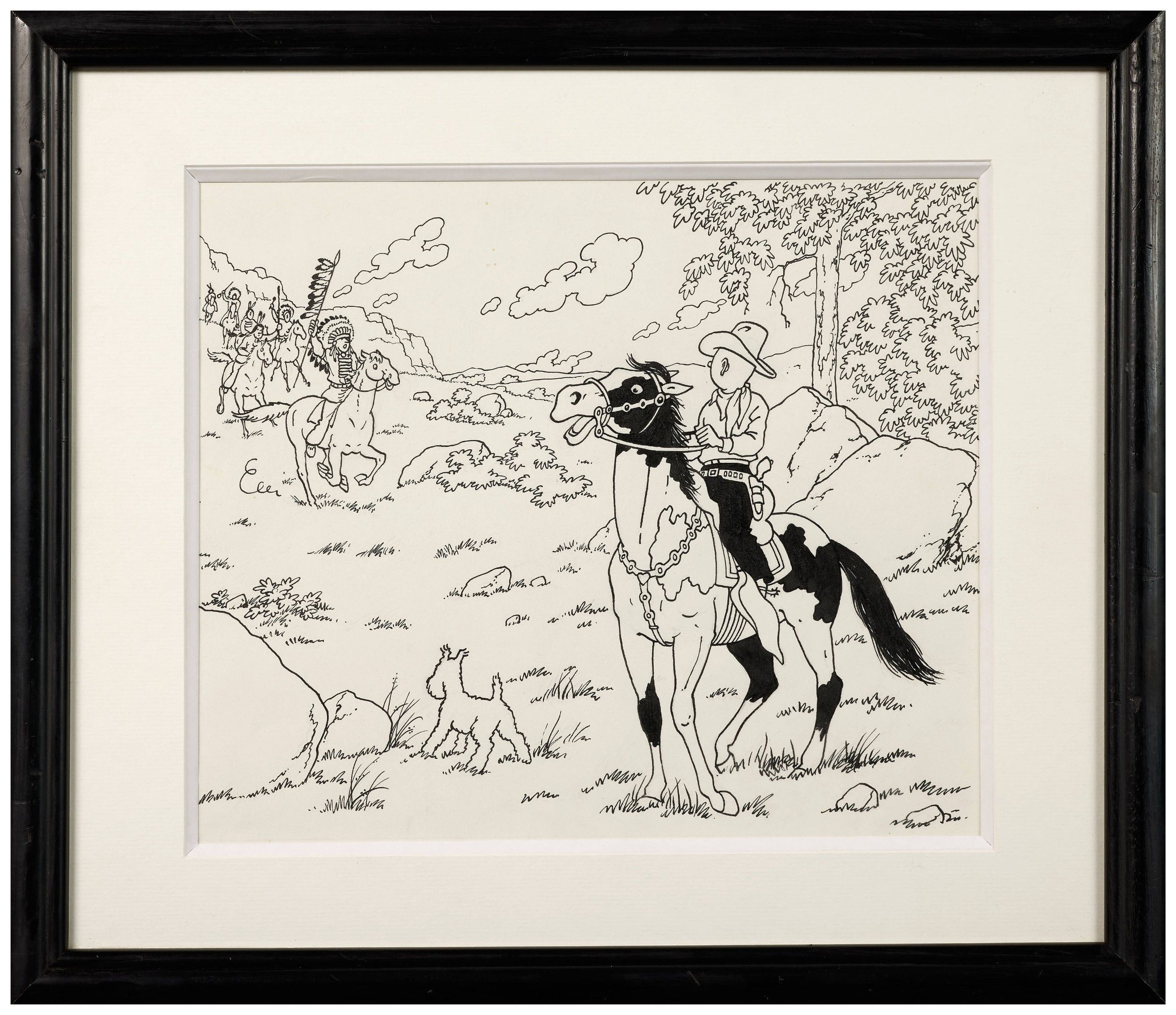 Tintin in America Indian ink on paper showing Tintin and Snowy being chased by Indians. A scene similar to the illustrations found in the colouring books published by Casterman. The characters and the horse are by Hergé. and Tintin, in search of Bobby Smiles, arrives in Redskincity. But the bandit, who is on an Indian reserve, has convinced the chief of the Blackfoot tribe, the Piercing-Eyed Mole, that the reporter wants to steal their hunting grounds. So the Indians dug up the hatchet and decided to capture the Paleface with the heart of a coyote. Sidebar