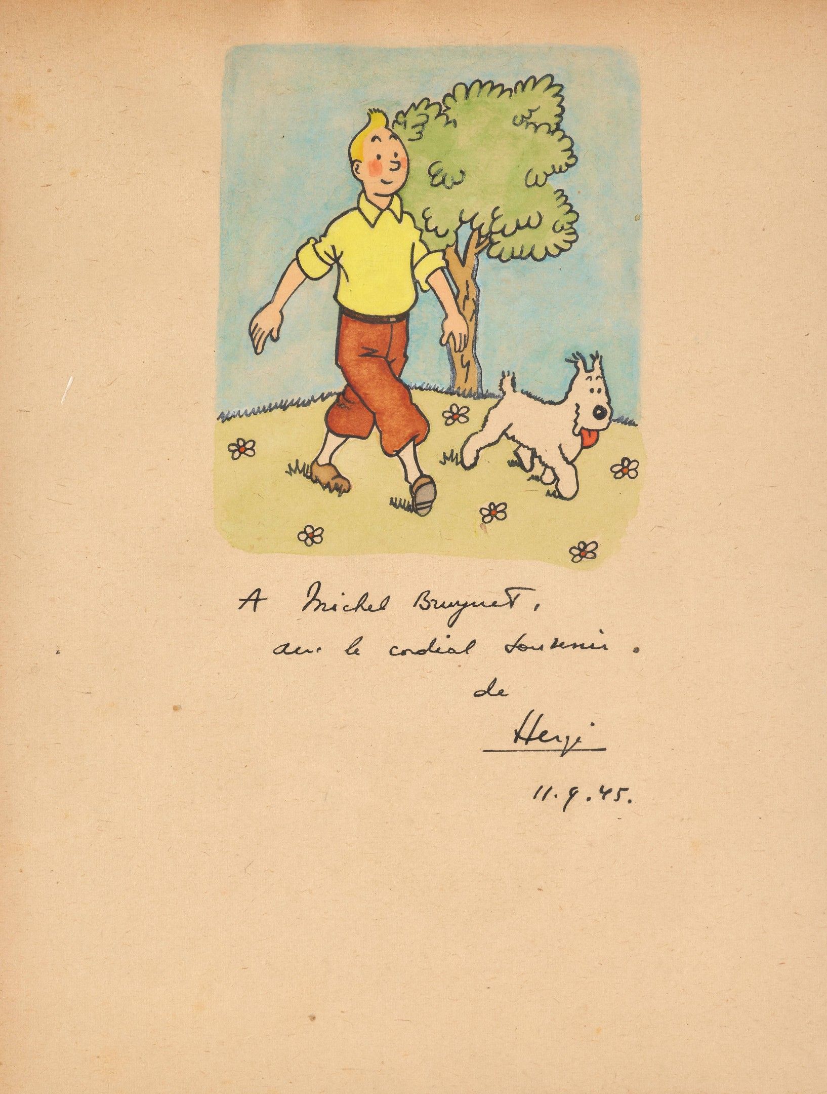 India ink and watercolour for an illustration showing Tintin accompanied by Snowy in a rural setting. Done on the back of a front page of an album of the adventures of Tintin.