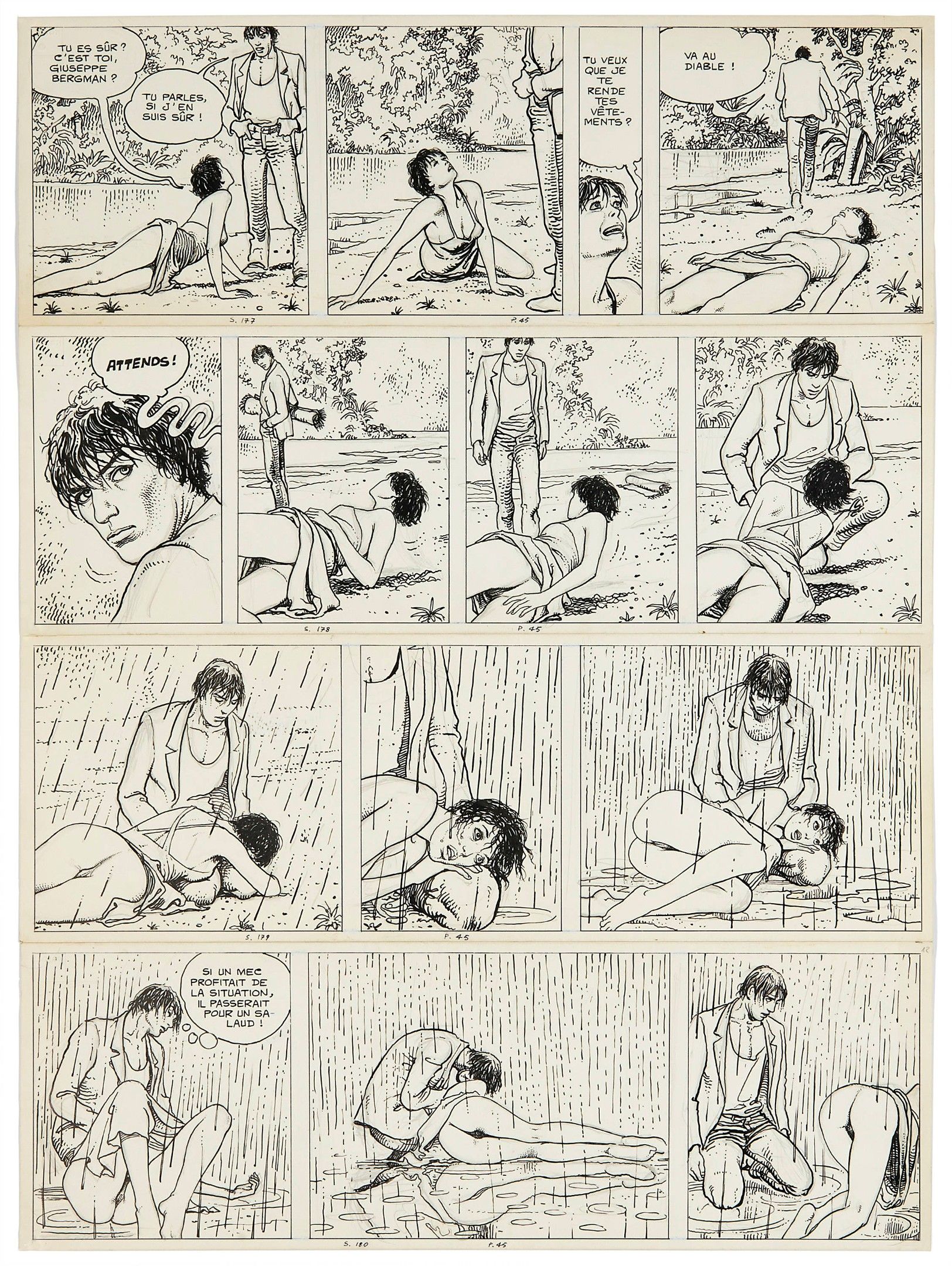 India ink on paper for the plate on page 136 of this album published in 1983 by Casterman. Chapter 7: "I want to know who I am". Story prepublished in the magazine (À Suivre) from September 1981 to April 1982 under the title Dies irae.