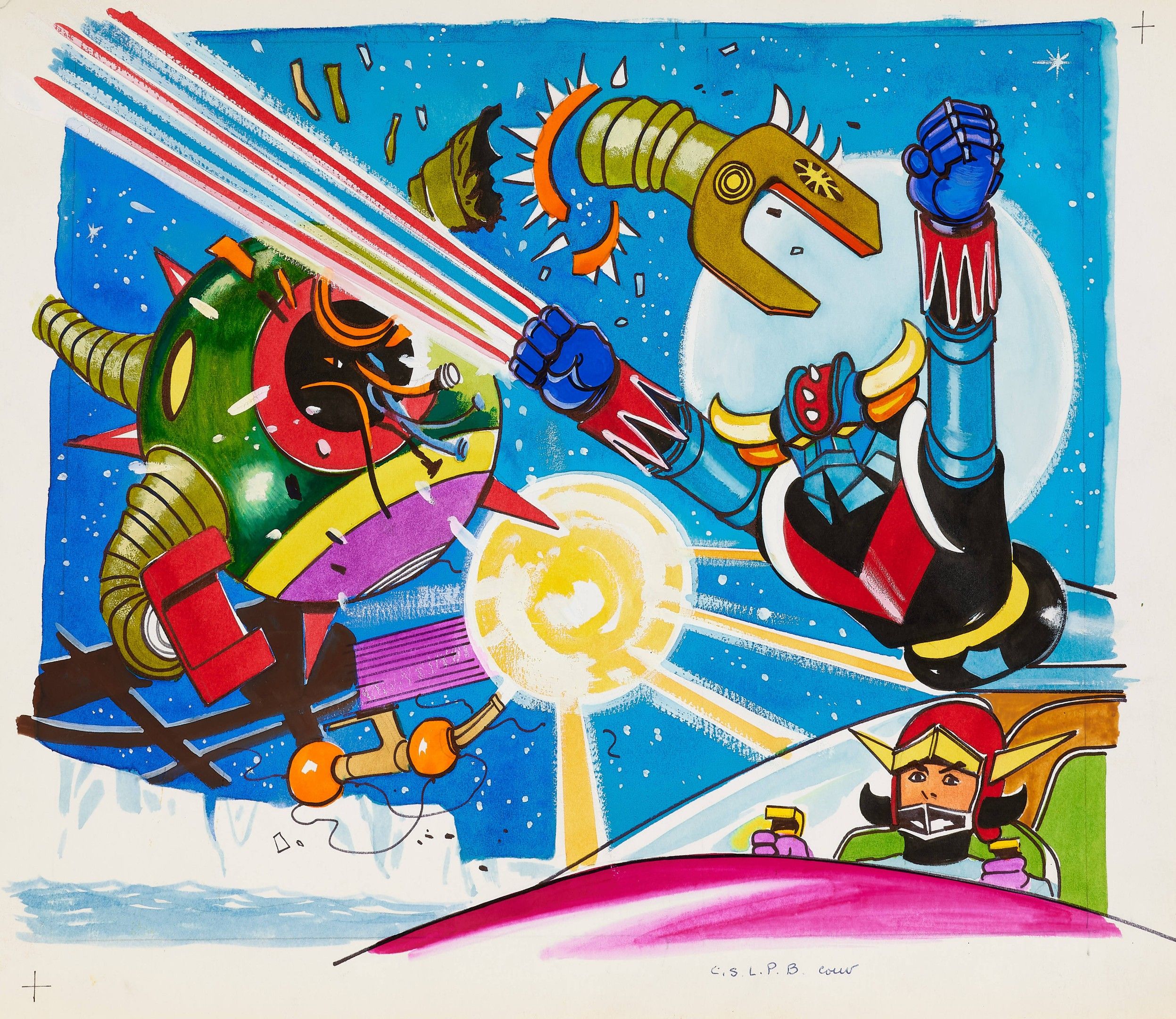 Cataclysm on the blue planet Felt pen, gouache and watercolour on paper for the cover of this album published in 1979 by G.P. rouge et or. Goldorak and Alcor destroy a monster from Vega that has come to attack Earth. Based on the UFO Robot Grendizer cartoon produced by Toei Animation and broadcast in Japan from October 1975 to February 1977.