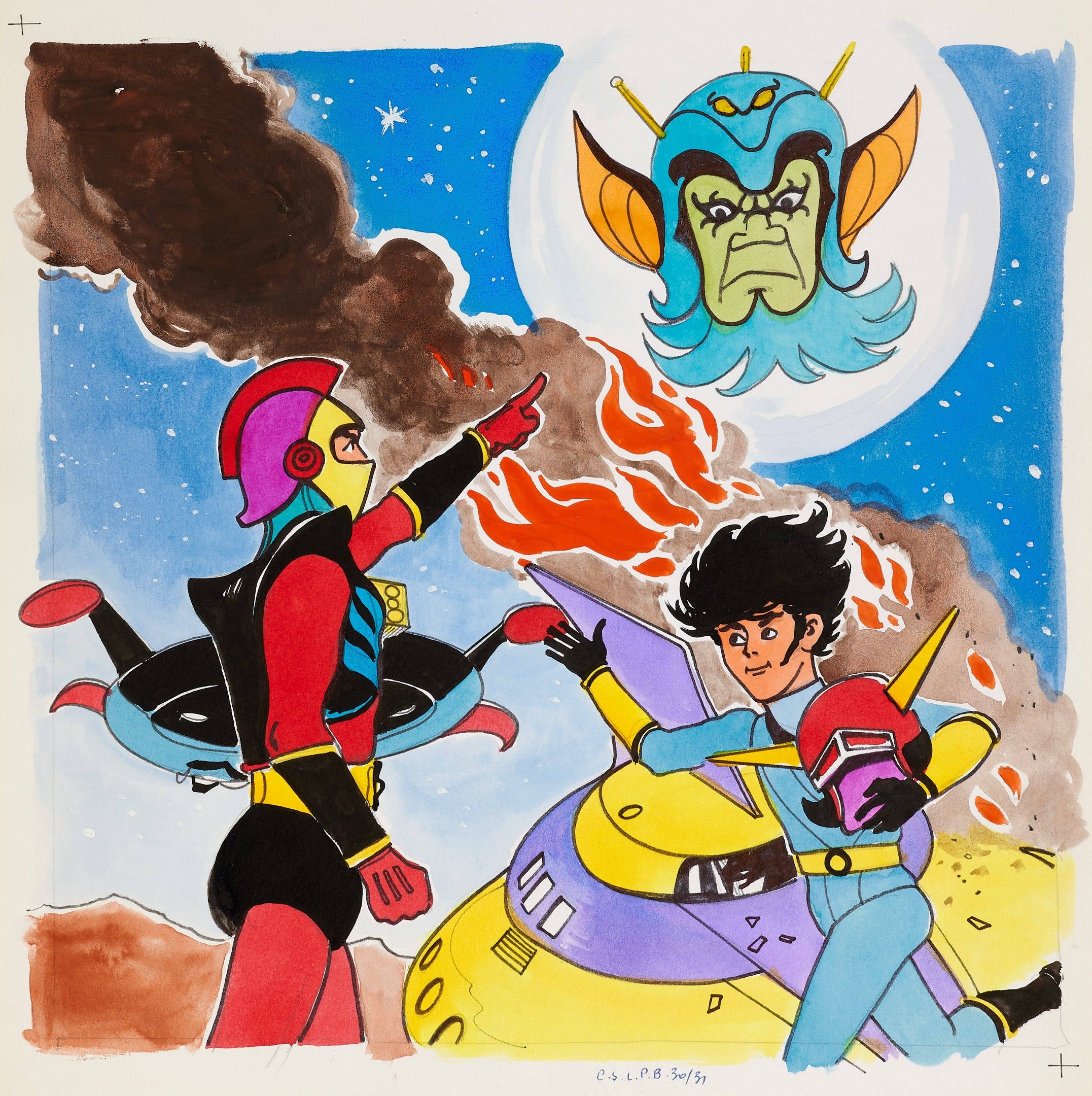 Felt pen, gouache and watercolour on paper for an illustration from this album published in 1979 by G.P. rouge et or. Alcor's saucer has been damaged, and Actarus has come to his rescue. Based on the UFO Robot Grendizer cartoon produced by Toei Animation and broadcast in Japan from October 1975 to February 1977.