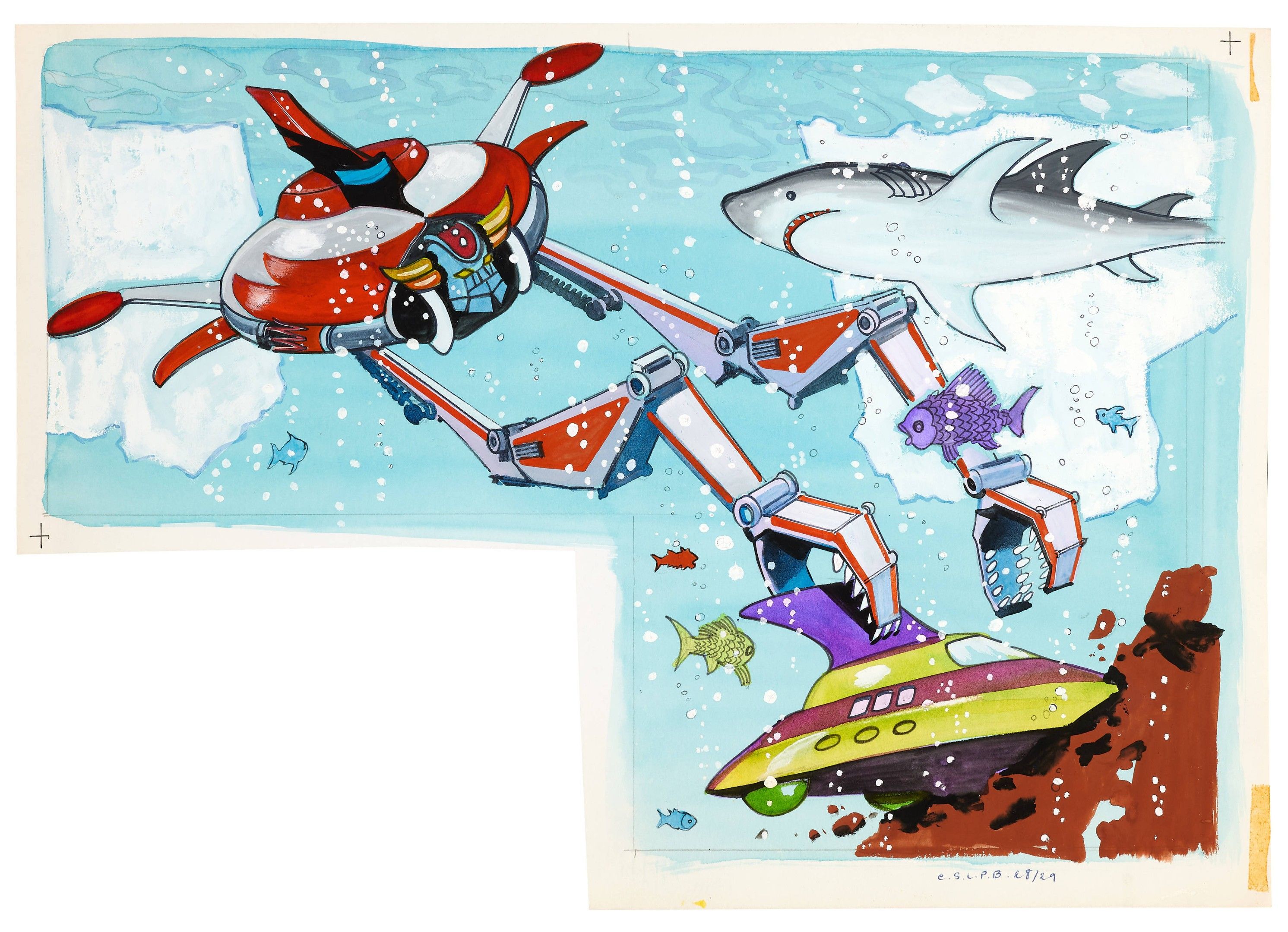 Felt pen, gouache and watercolour on paper for an illustration of this album published in 1979 by G.P. rouge et or. Goldorak comes to recover Alcor's saucer, which has sunk to the bottom of the sea. Based on the UFO Robot Grendizer cartoon produced by Toei Animation and broadcast in Japan from October 1975 to February 1977.