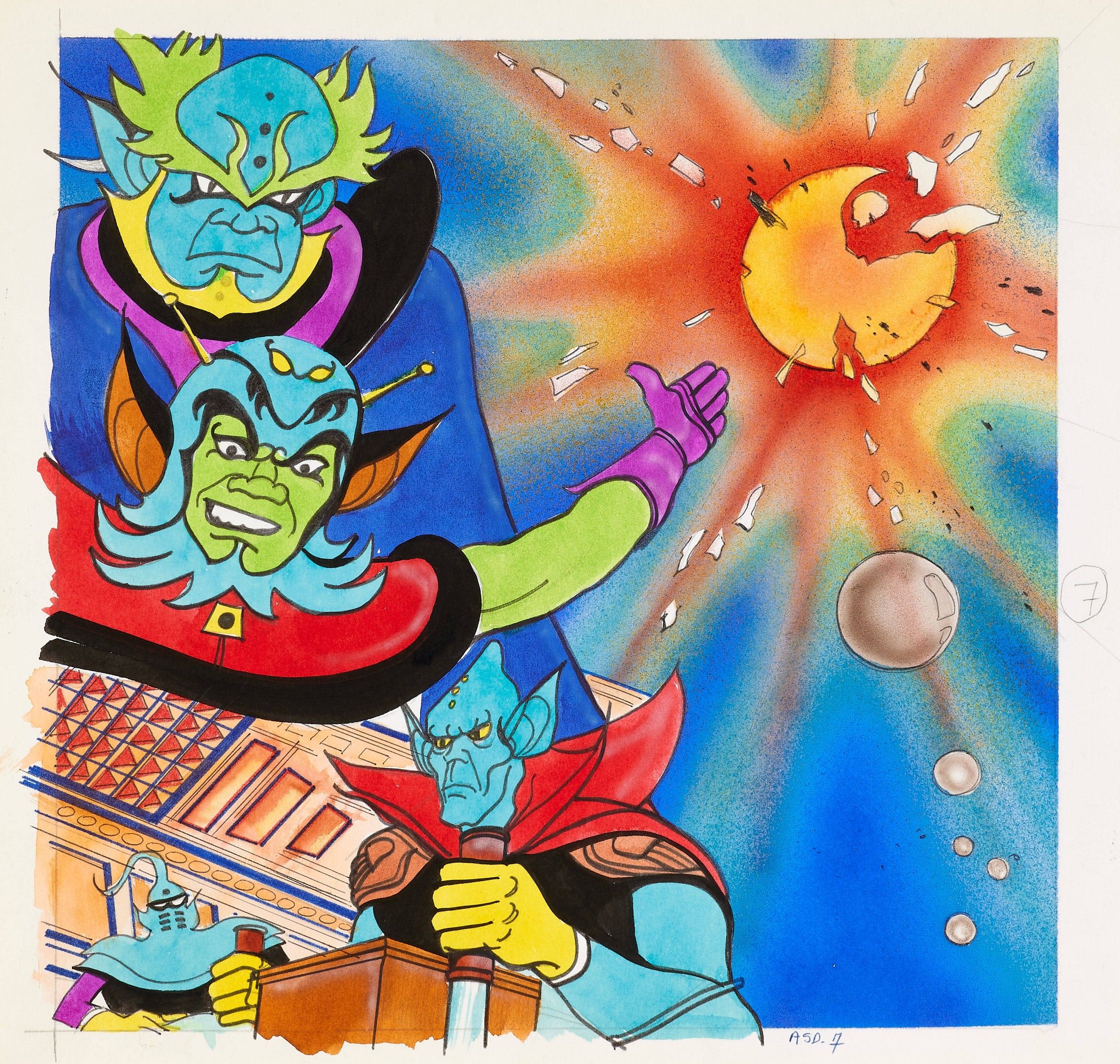 Felt pen, gouache and watercolour on paper for the cover of this album published in 1979 by G.P. rouge et or. The sinister ruler of Vega and his subordinates are preparing a new attack. Based on the UFO Robot Grendizer cartoon produced by Toei Animation and broadcast in Japan from October 1975 to February 1977.
