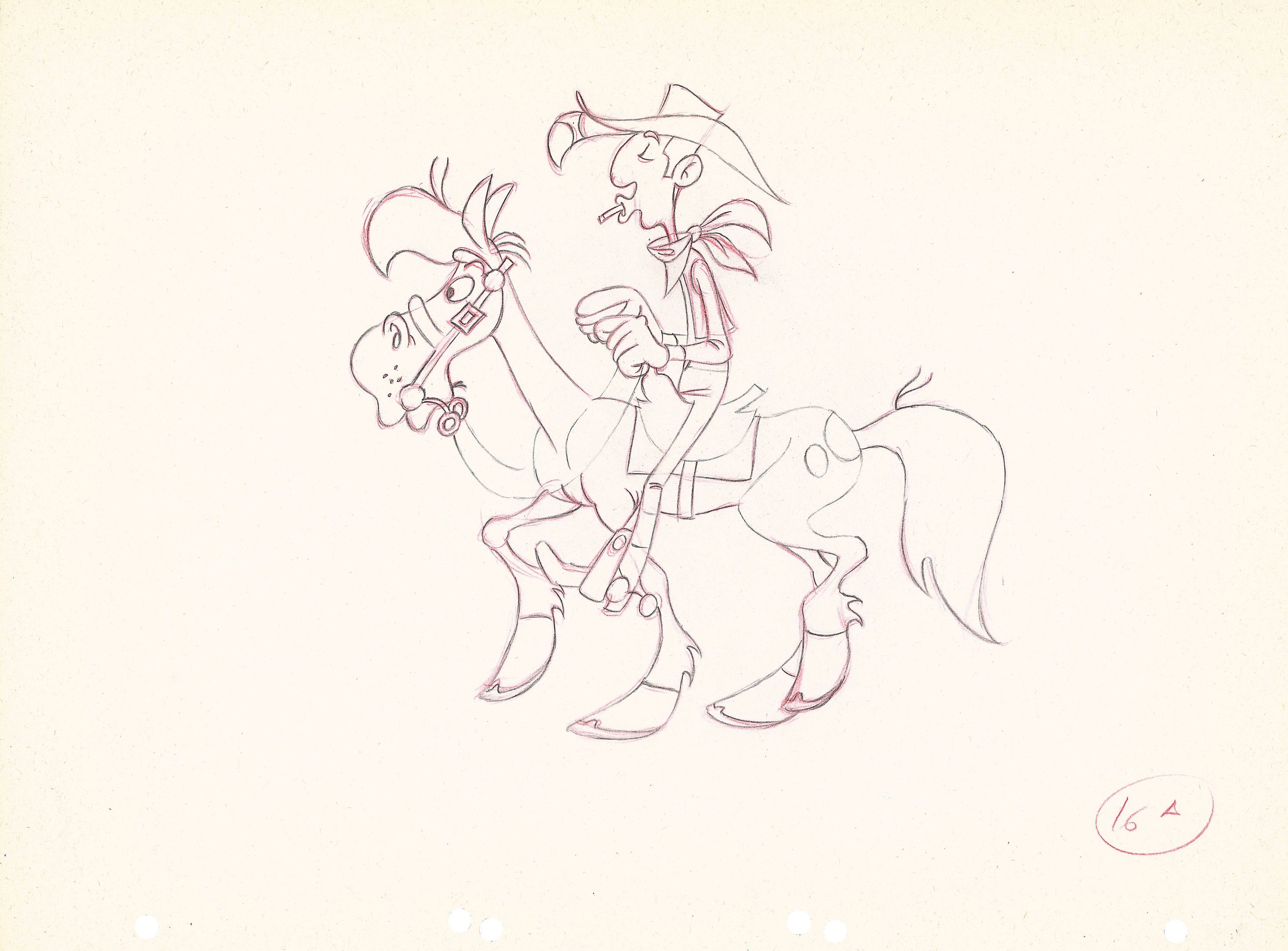 Lucky Luke and Jolly Jumper Graphite on paper for an illustration depicting these two characters, intended for this animated film made in 1971 by Belvision. Studio work.