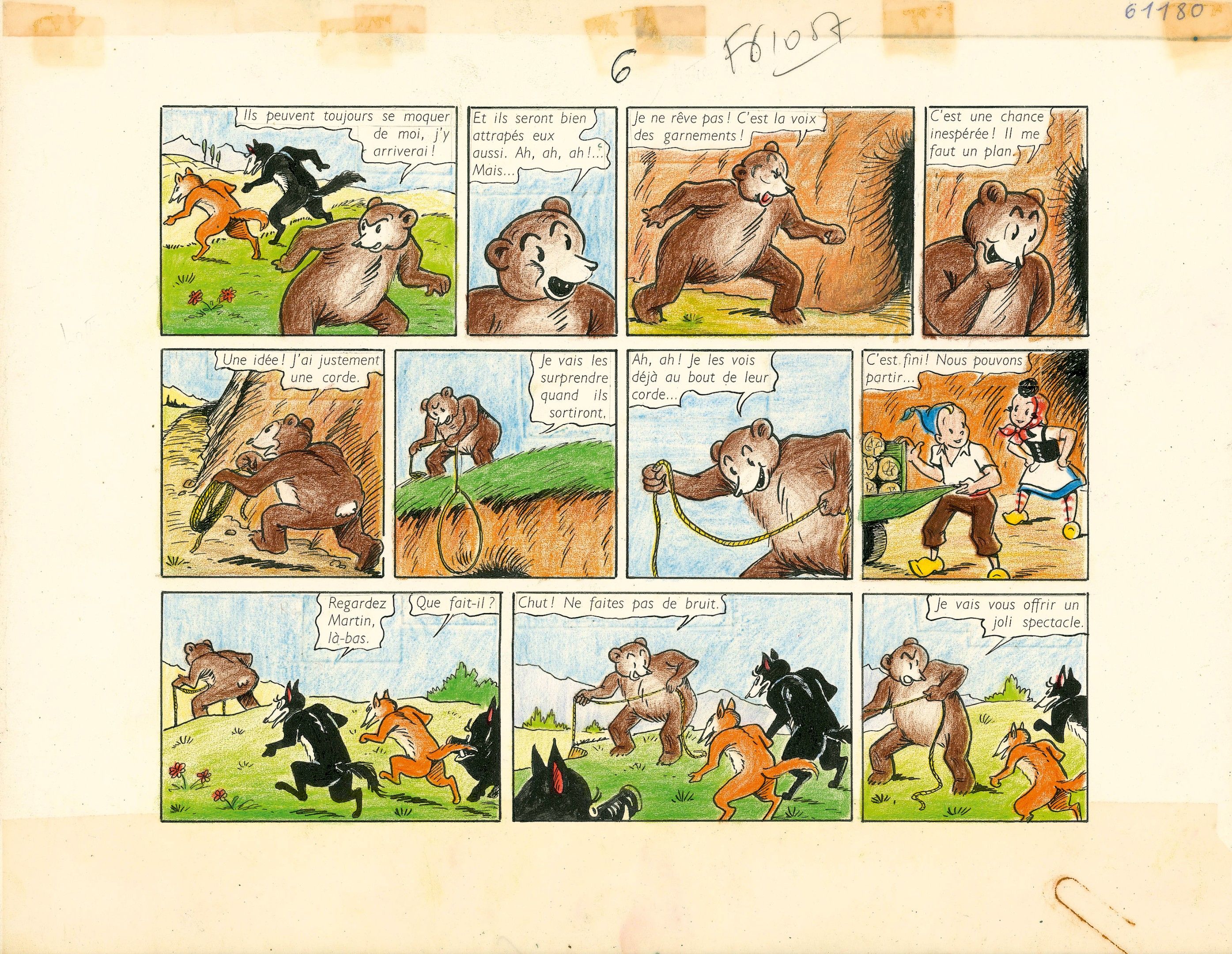 India ink on paper for plate 6 of an album in this series published by Fleurus. Coloured in pencil on tracing paper. After Maurice Cuvillier. The new series began in 1967 (Fleurette Albums collection).