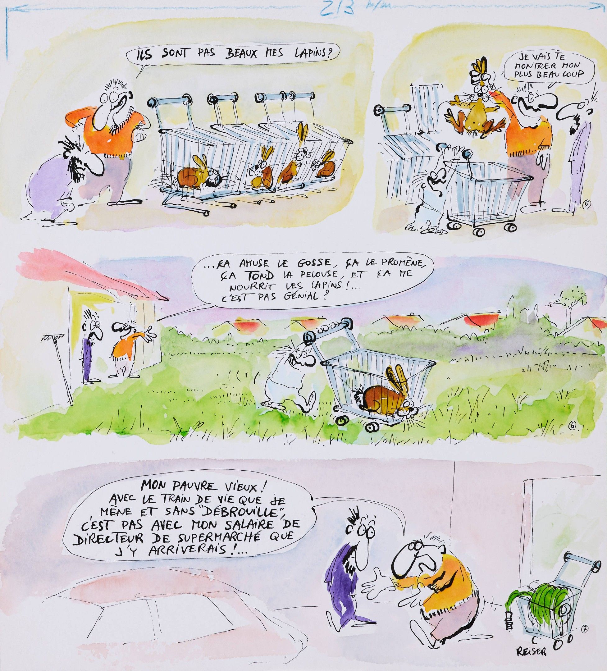 Reiser takes a look at the lesser-known side of supermarkets: a supermarket manager, unhappy with his pay, is forced to turn rabbits into lawnmowers to improve his lifestyle.