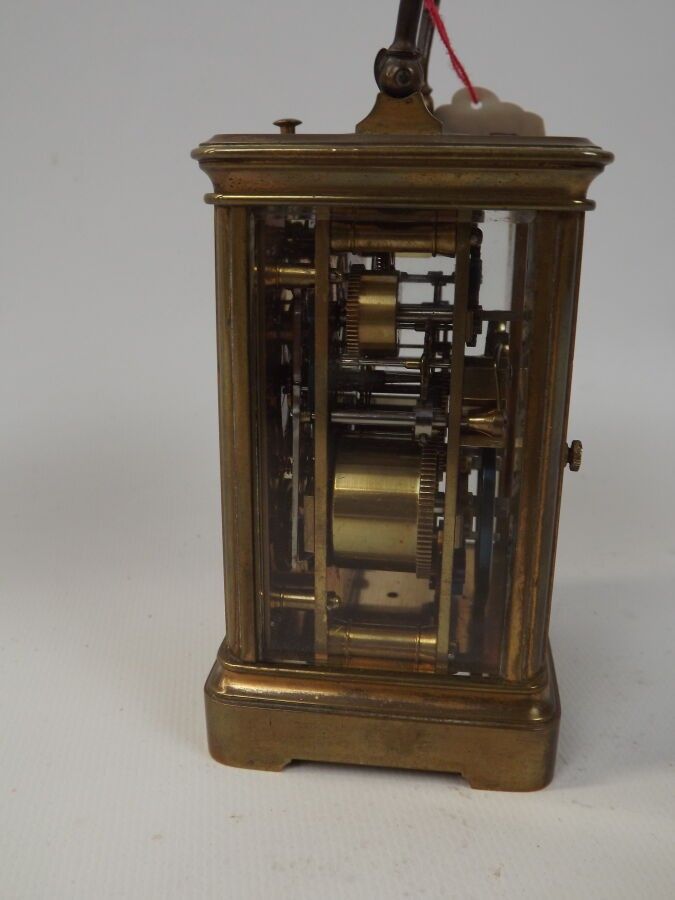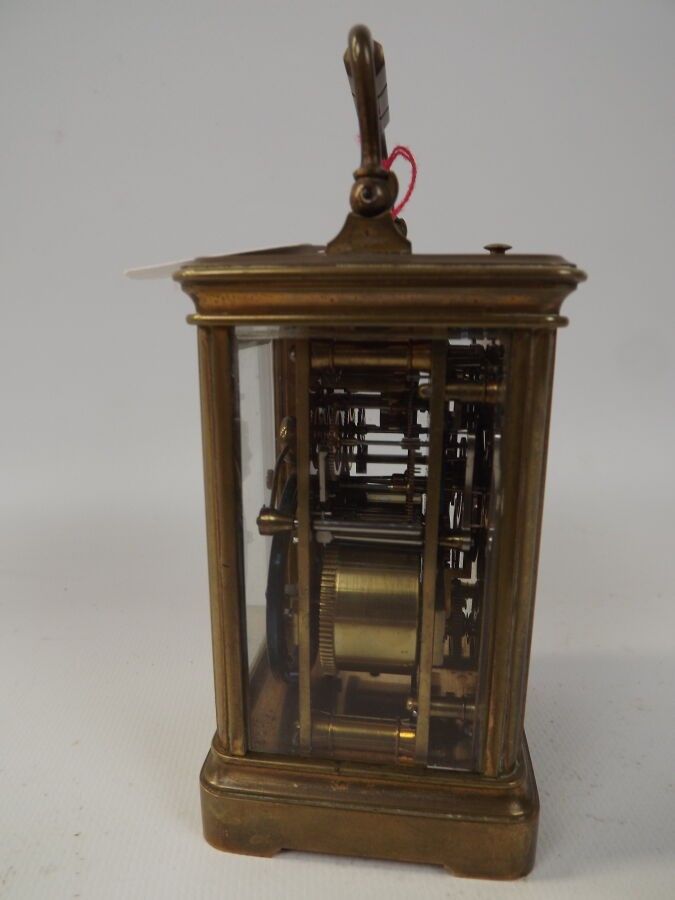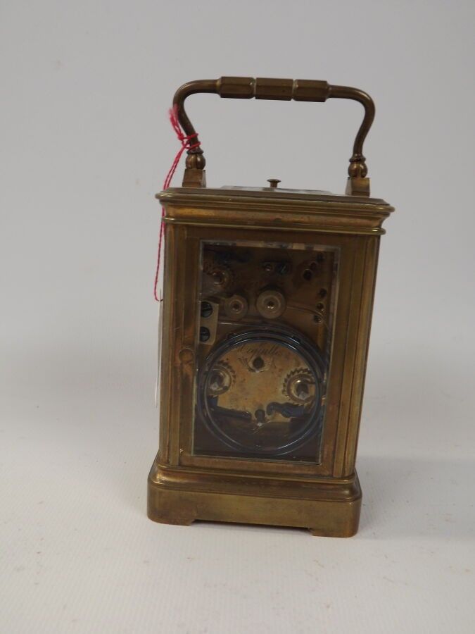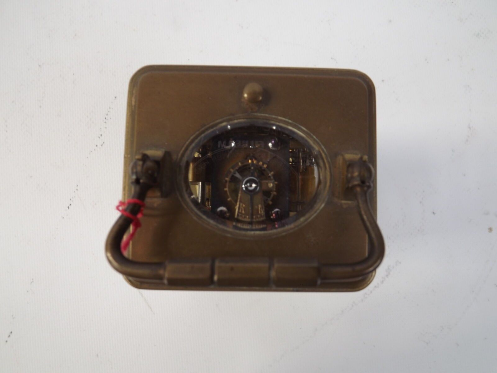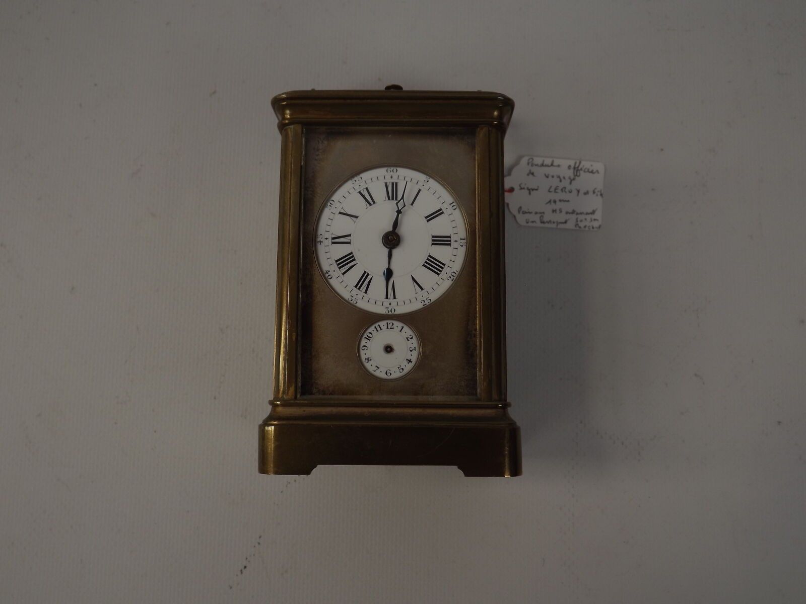 Officer's gilt brass reveille clock with double white enamelled dials, 5 glazed sides. N°8548, used condition, mechanism not tested. Missing hands. Height: 13.5 cm