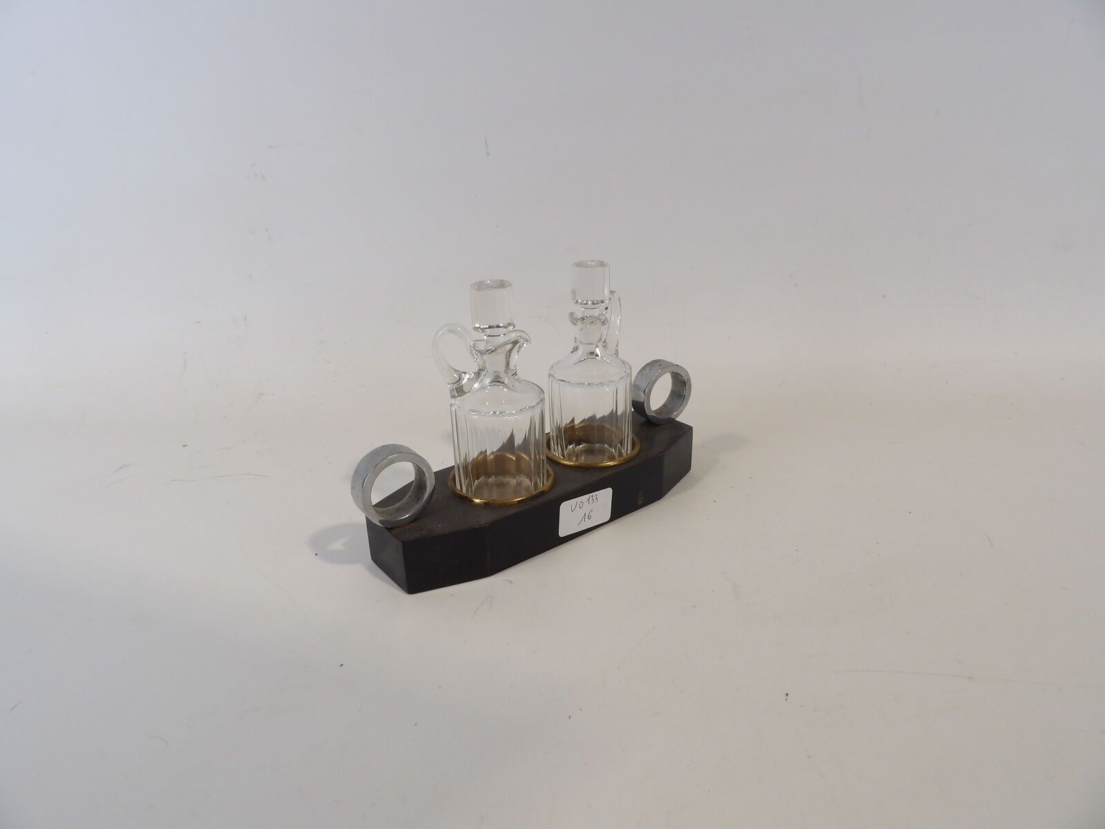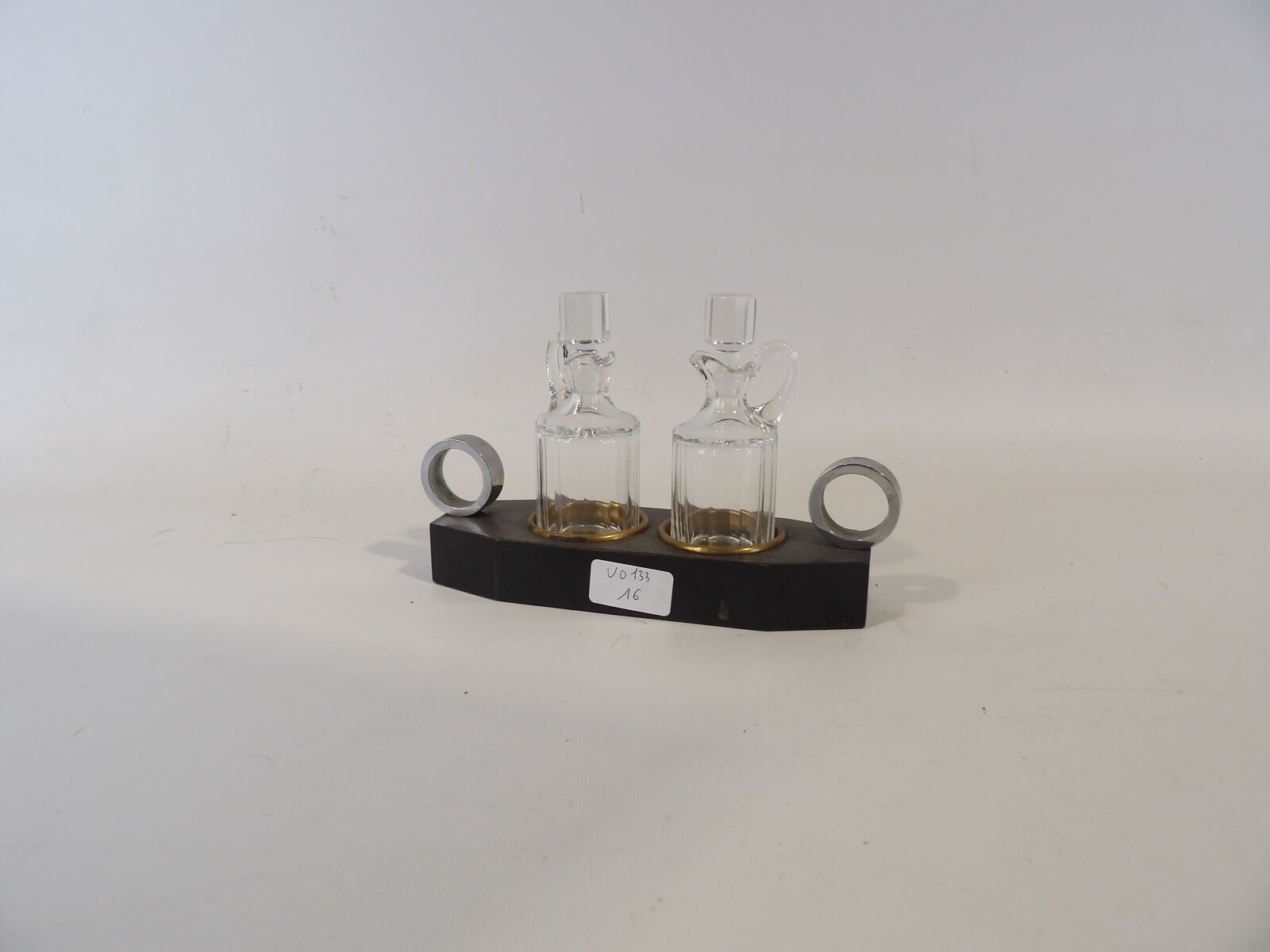Art Deco style oil and vinegar cruet with 2 glass bottles and stained wood and metal base, 20th century, used condition.