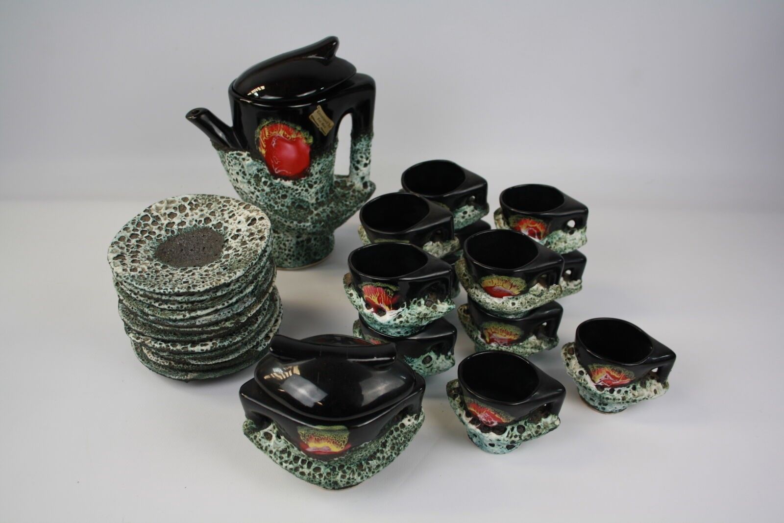 VALLAURIS, part of an earthenware coffee service decorated with meerschaum, comprising 1 coffee pot, 12 cups, 12 saucers, 1 sugar bowl. Circa 1950. Unsigned, used condition