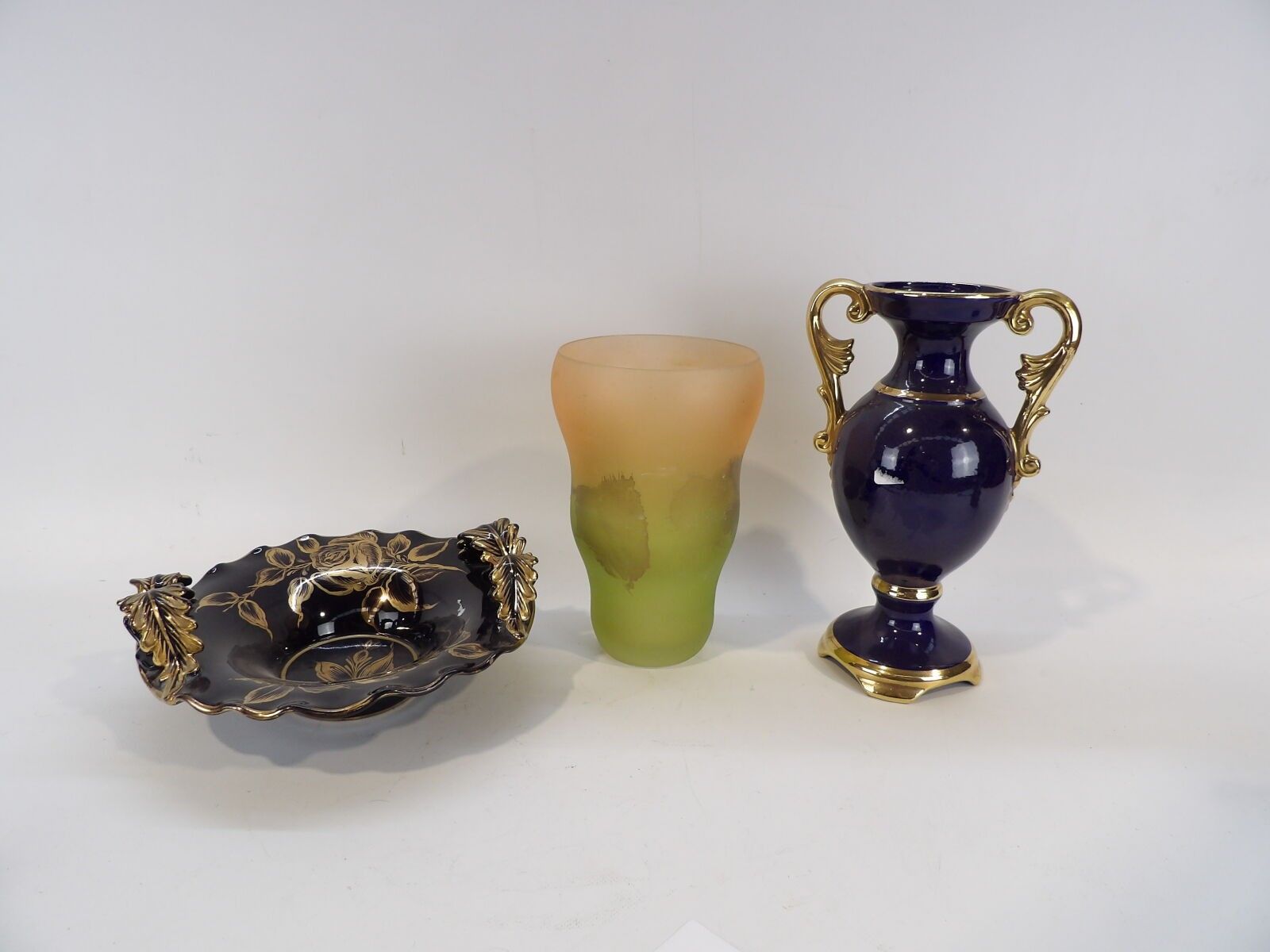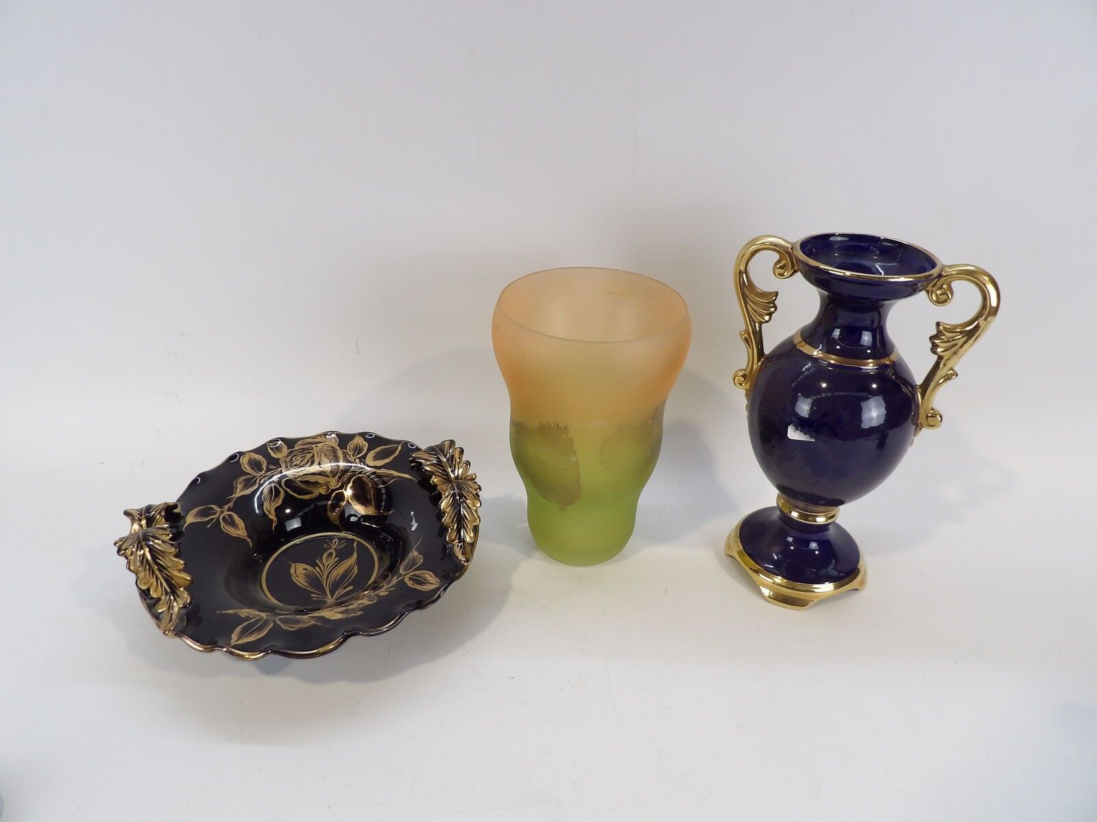 Set of a polychrome earthenware dish with gilded floral decoration, Ht.10 x Ø26cm, a green, orange and gilded glass vase, Ht.23cm, a blue and gilded earthenware vase with 2 handles, Ht.28cm