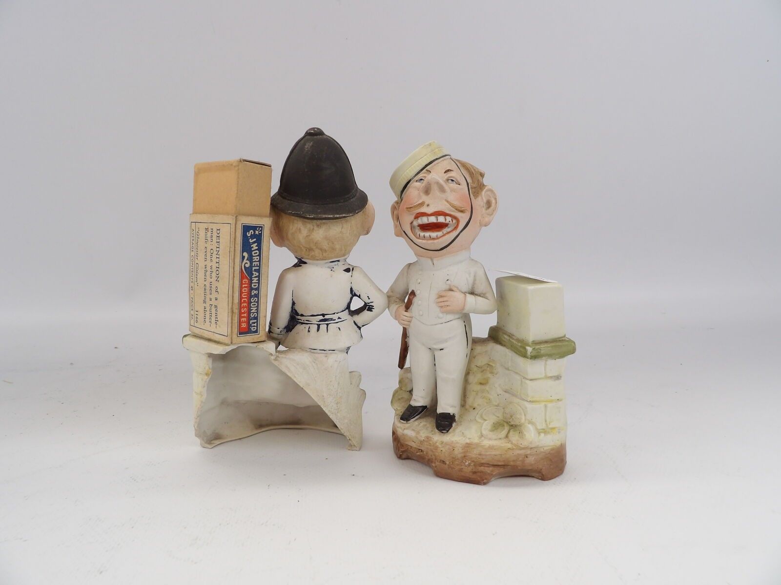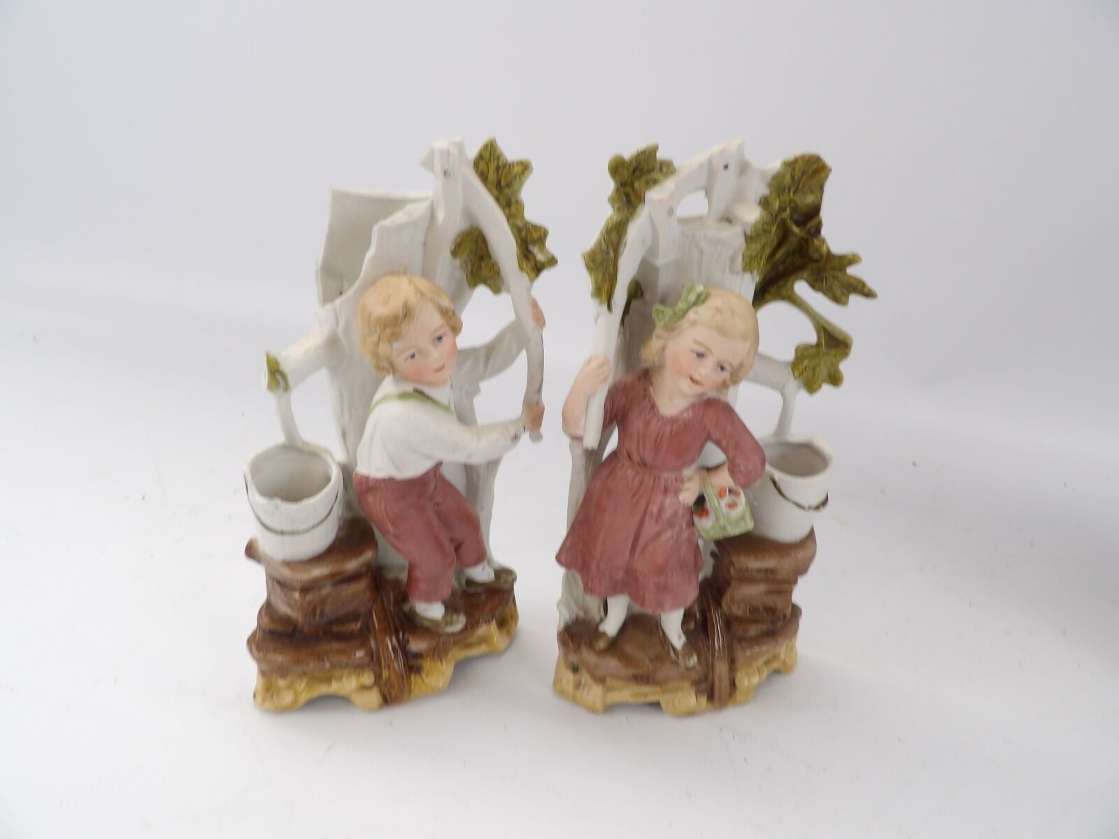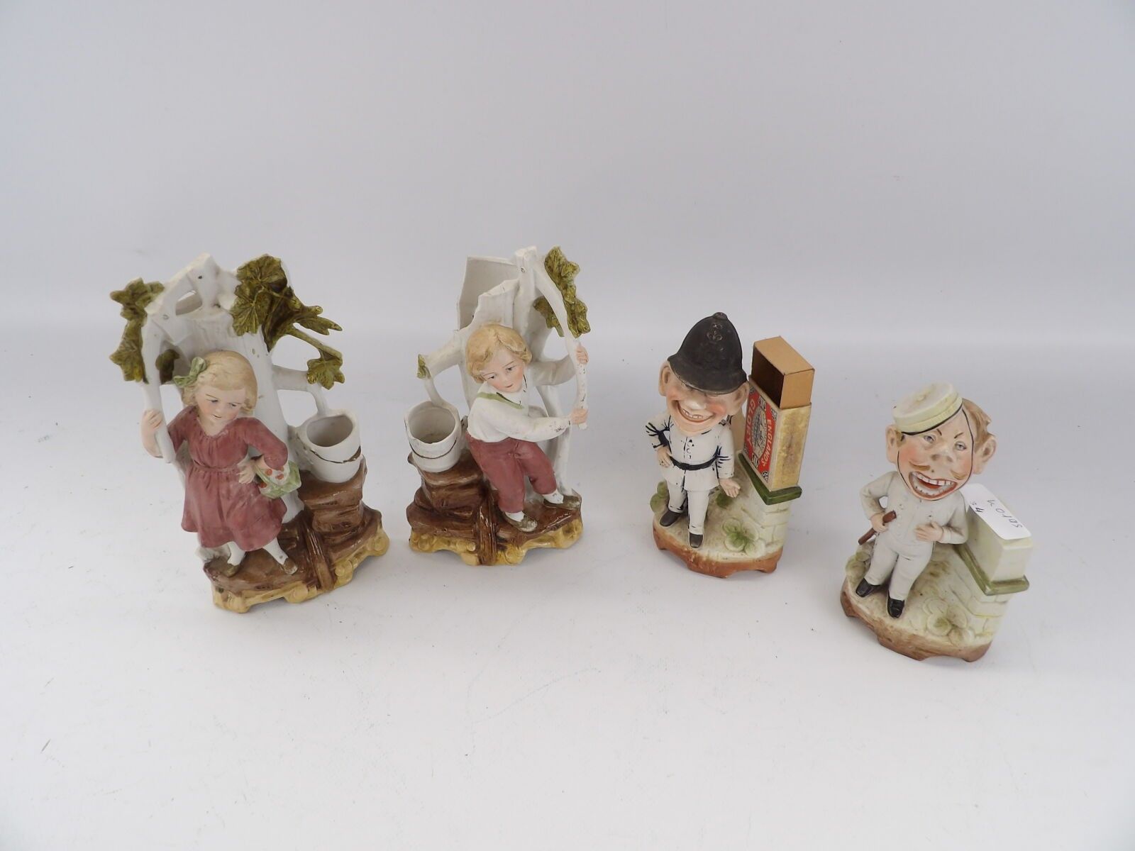Set of 4 polychrome biscuits including a young couple near a tree, Ht.20cm (accidents) and 2 match holders, Ht.15cm (accidents), used condition