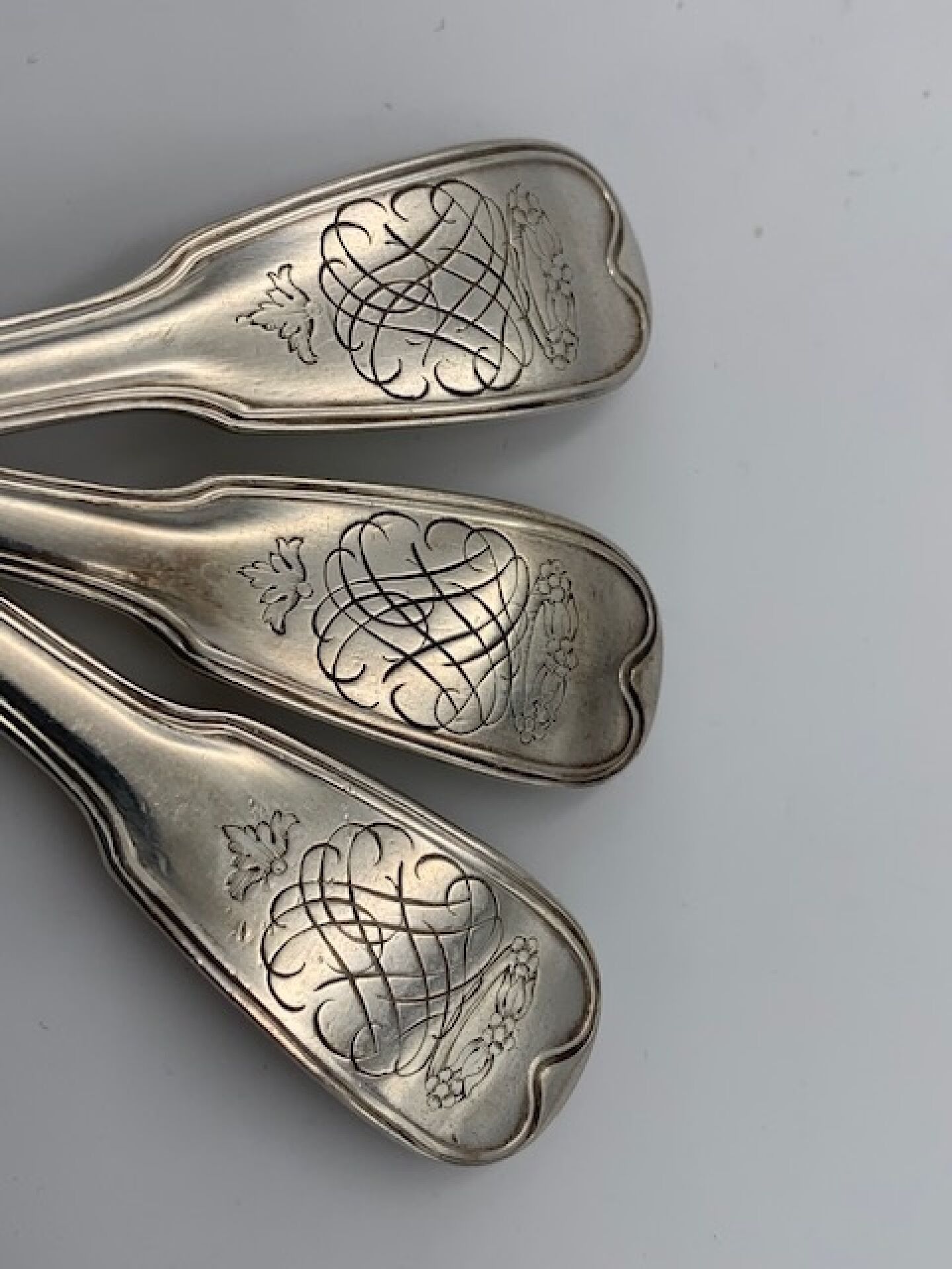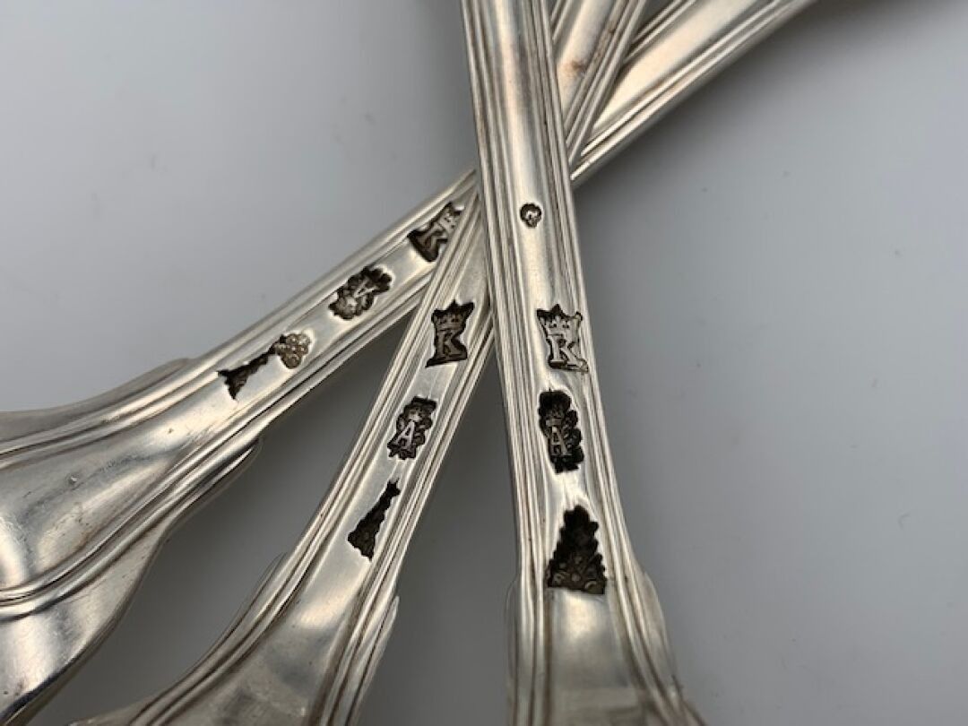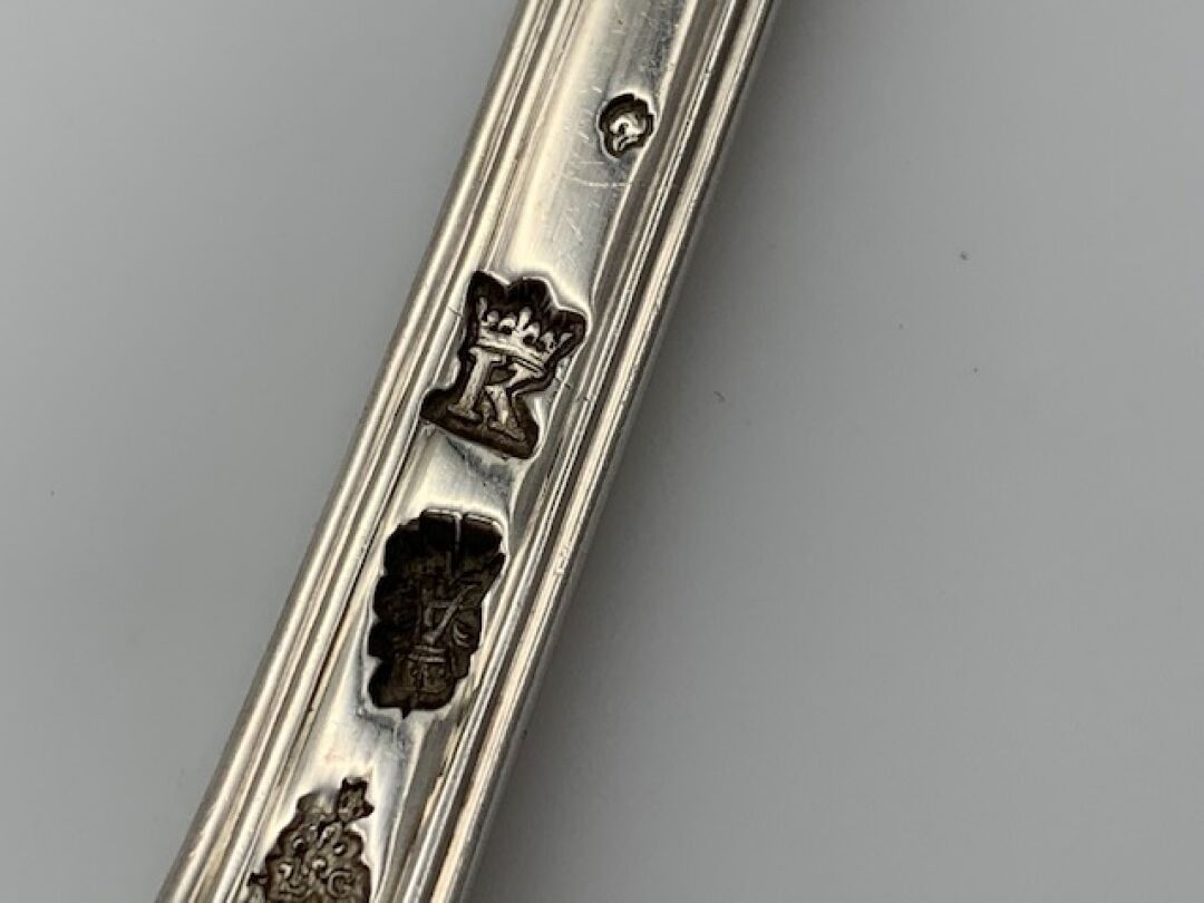 A perfect suite of six (6) silver flatware, filets pattern, the spatulas engraved with a period mavelot under a crown. 18th century Fermiers Généraux hallmarks. PARIS 1750 (letter K). Marked by the master goldsmith Eloi GUÉRIN received in 1727. Weight: 1110g. Identical hallmarks on all pieces