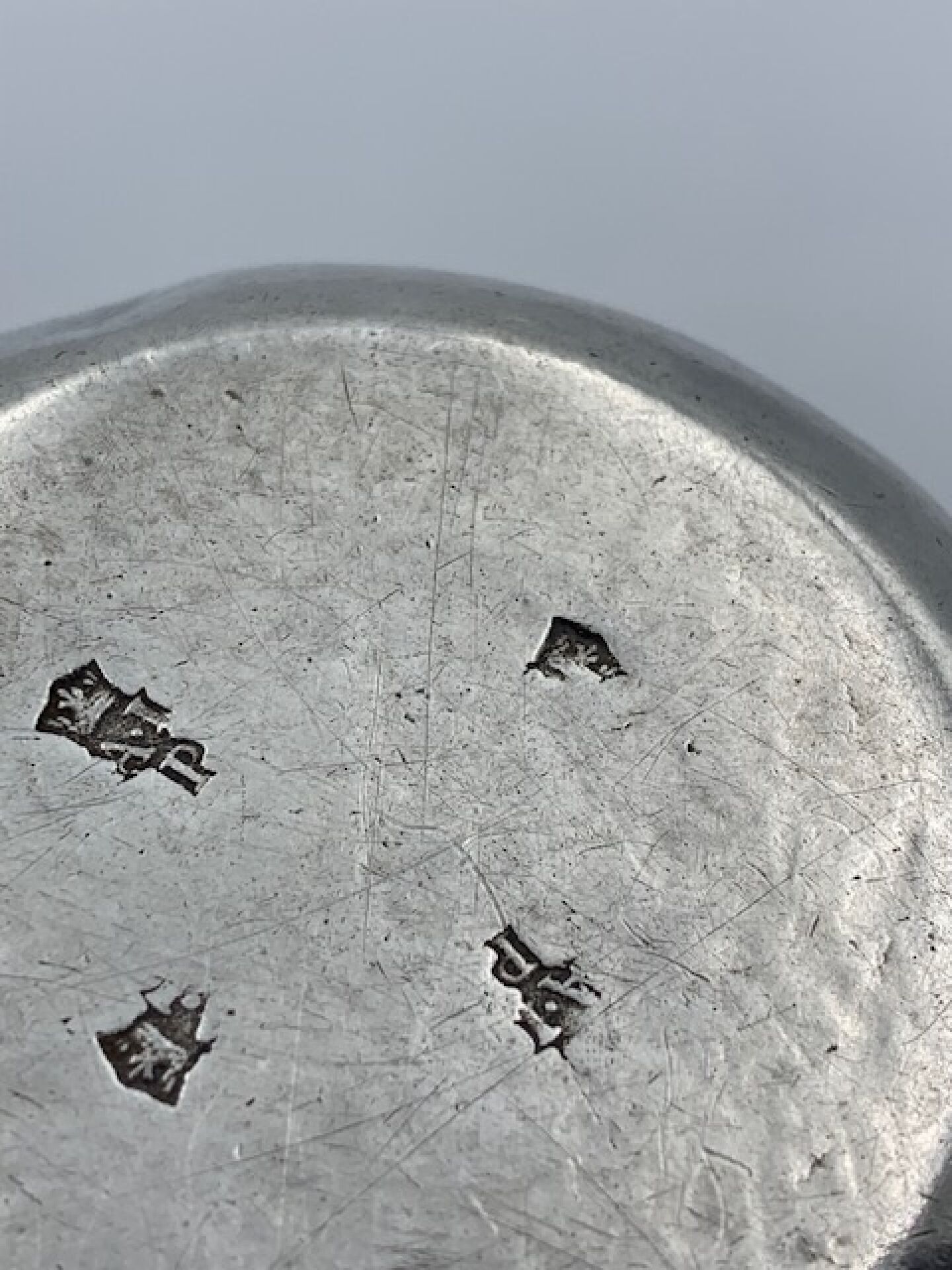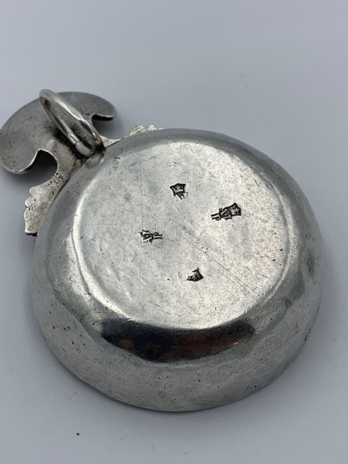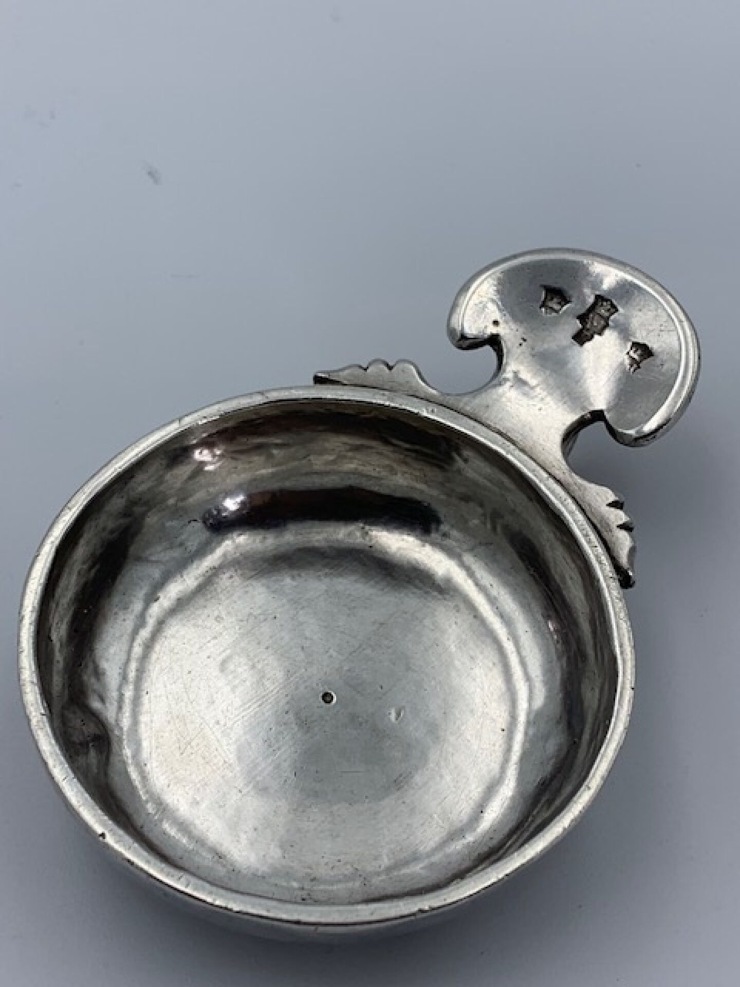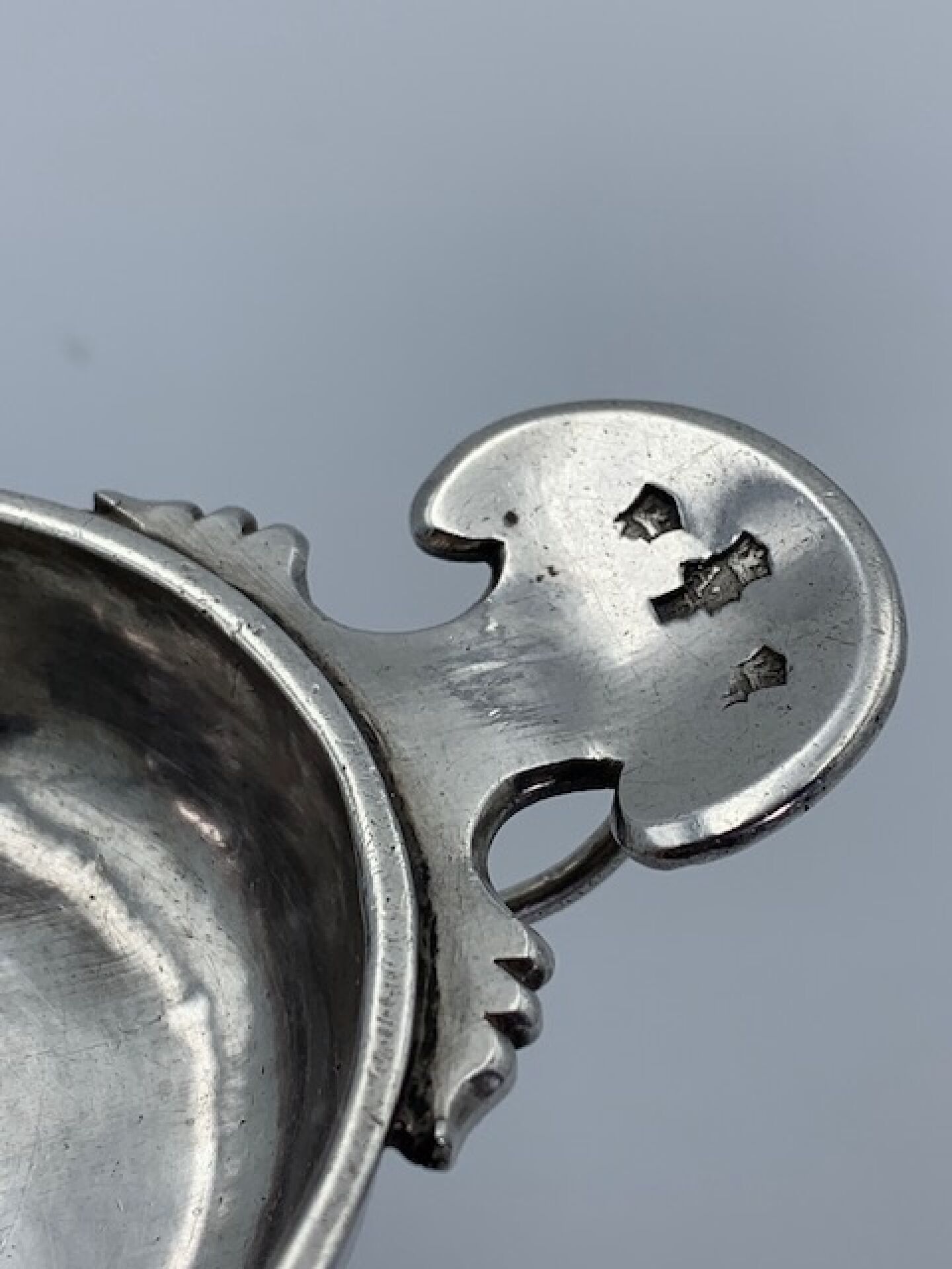 Plain silver wine stein, cut-out thumb rest model. 18th century Fermiers Généraux hallmark. Goldsmith's hallmark repeated four times. Typical regional work from Angoumois, Poitou or Saintonge Weight : 98g.