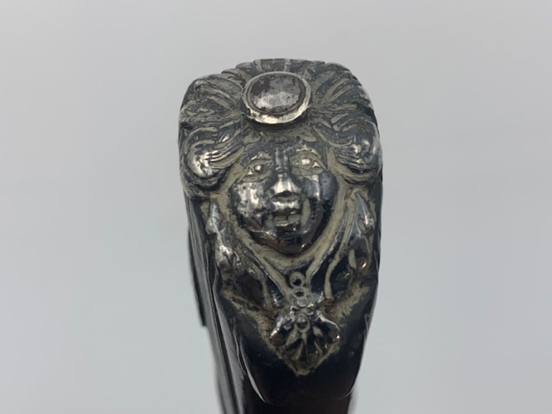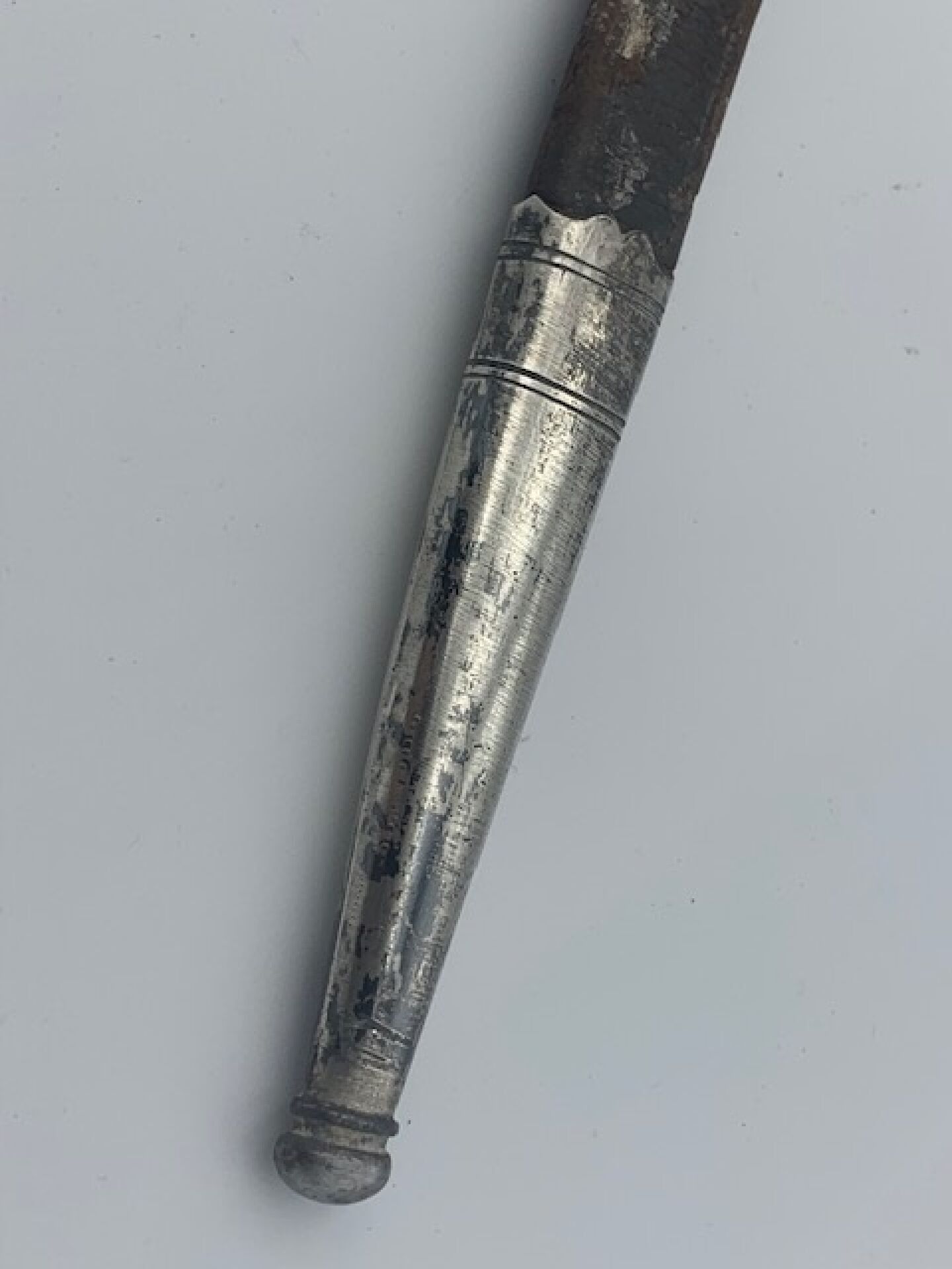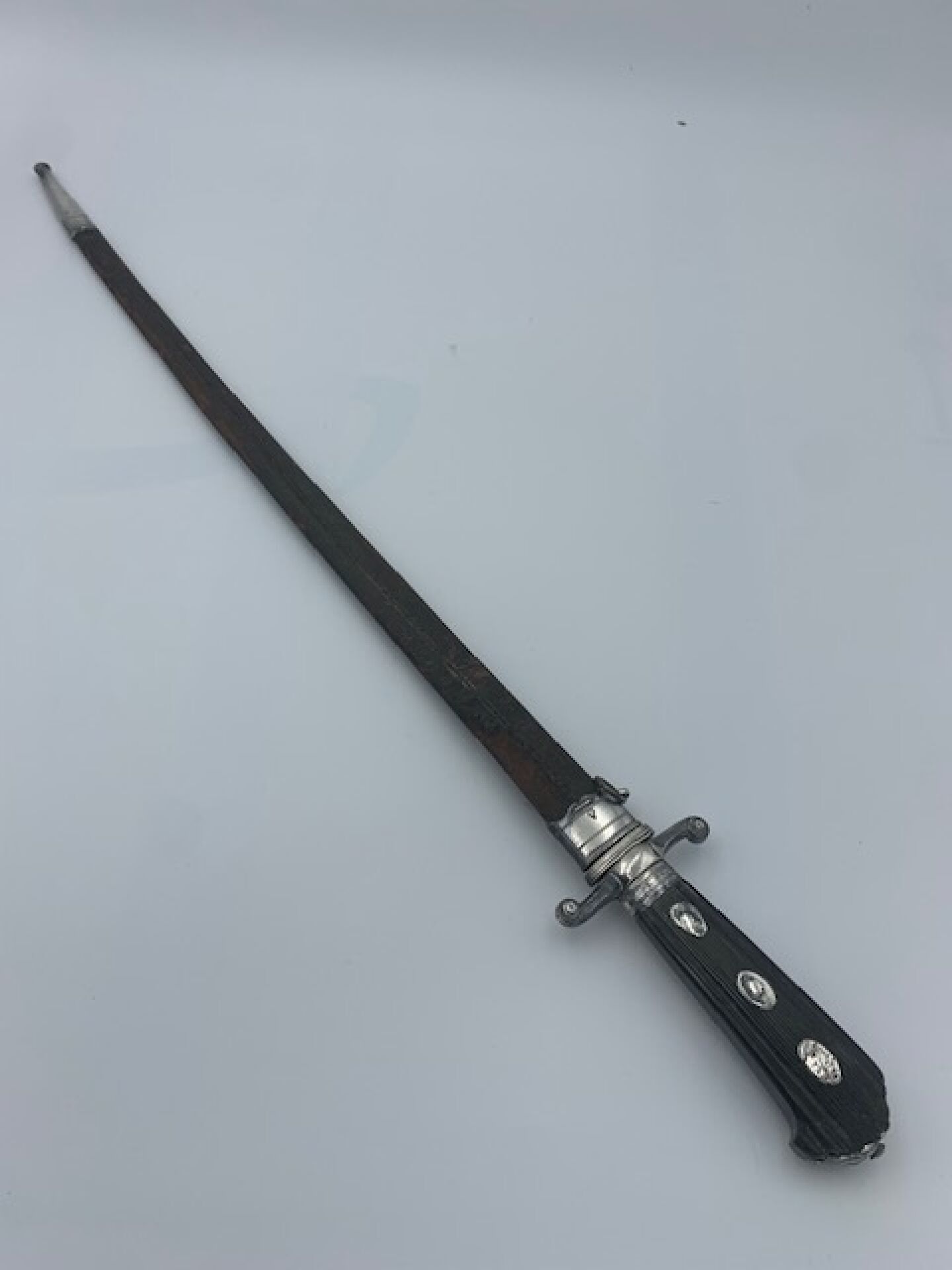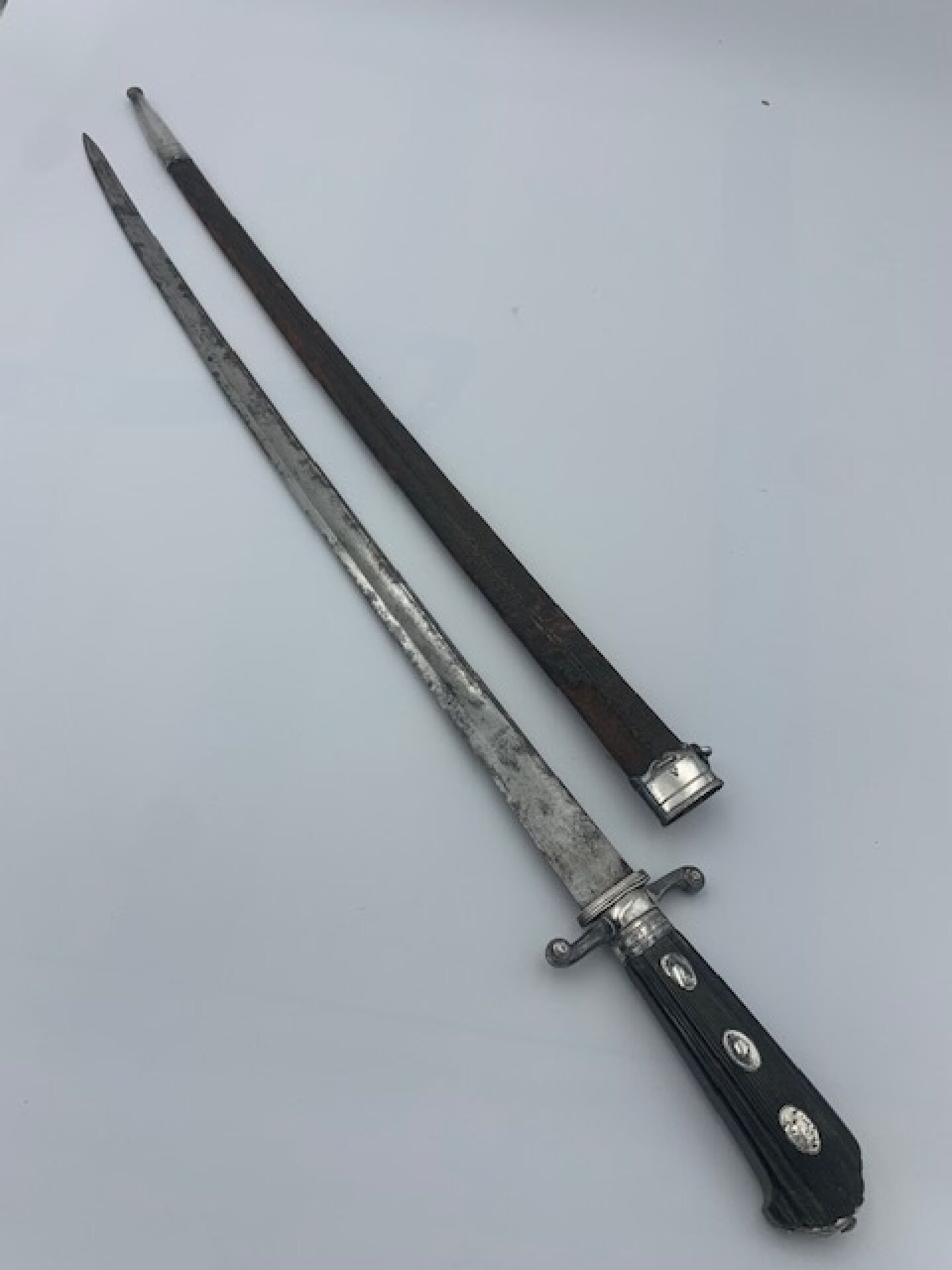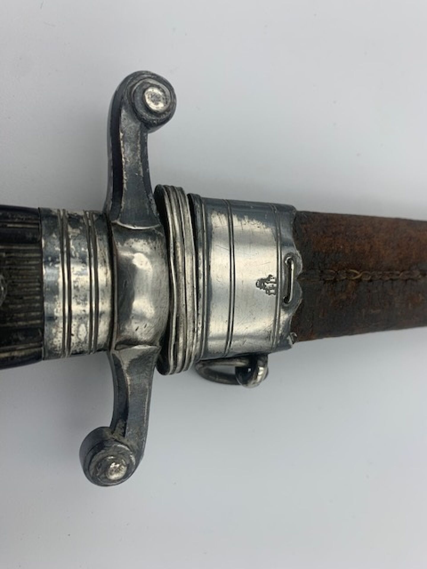 18th century hunting or venery dagger, ebony spindle with silver fittings, silver hilt (hallmarked) with two inverted straight quillons, engraved single-edged curved blade. LOUIS XV period. LAVAL circa 1770. Master goldsmith : Pierre LE BOURDAIS received in 1766. Length : 77 cm. Complete with black leather scabbard with silver fittings. Mark reproduced in the book "Les orfèvres d'Anjou et du bas Maine" Ed. du Patrimoine page 212