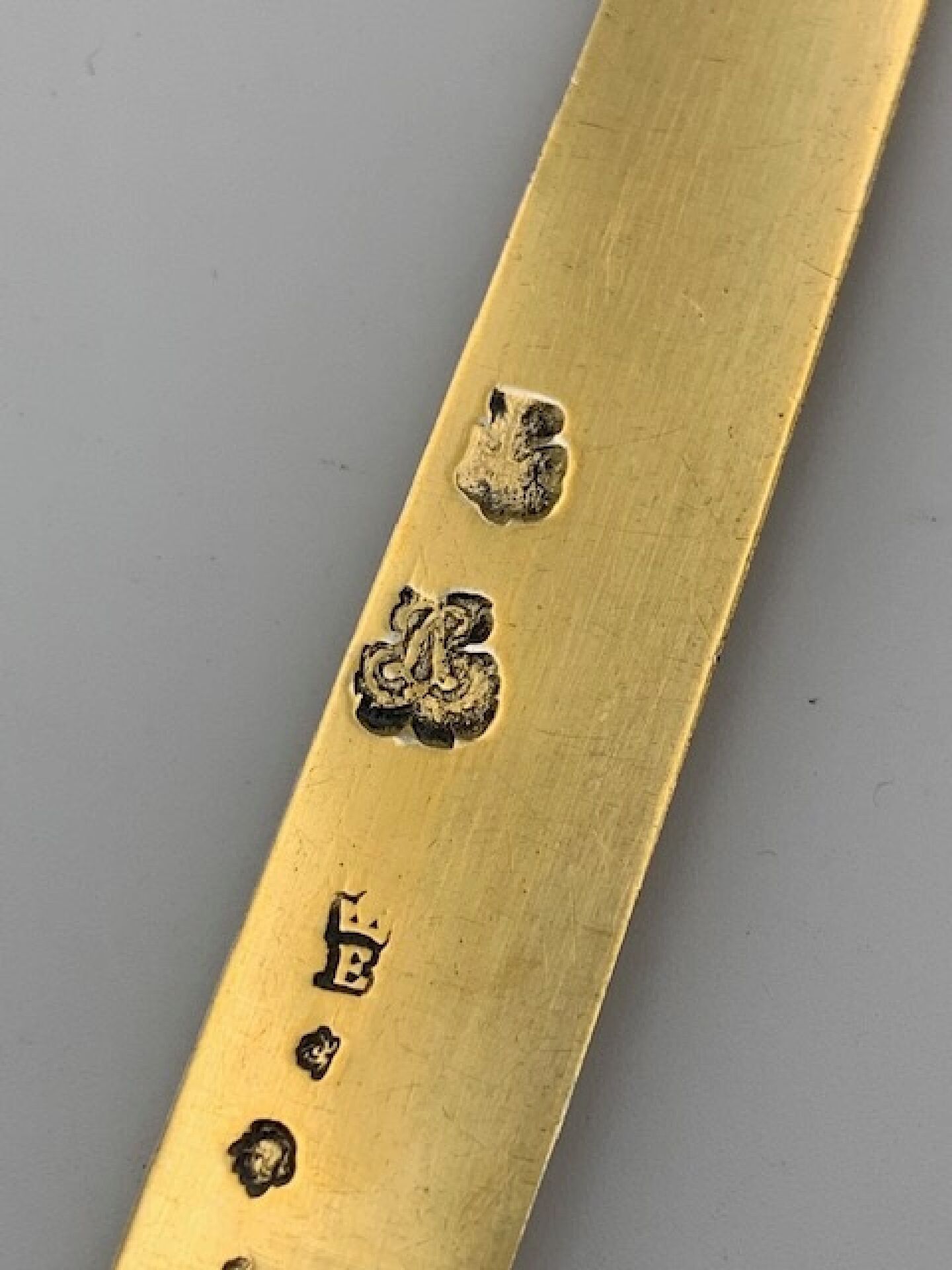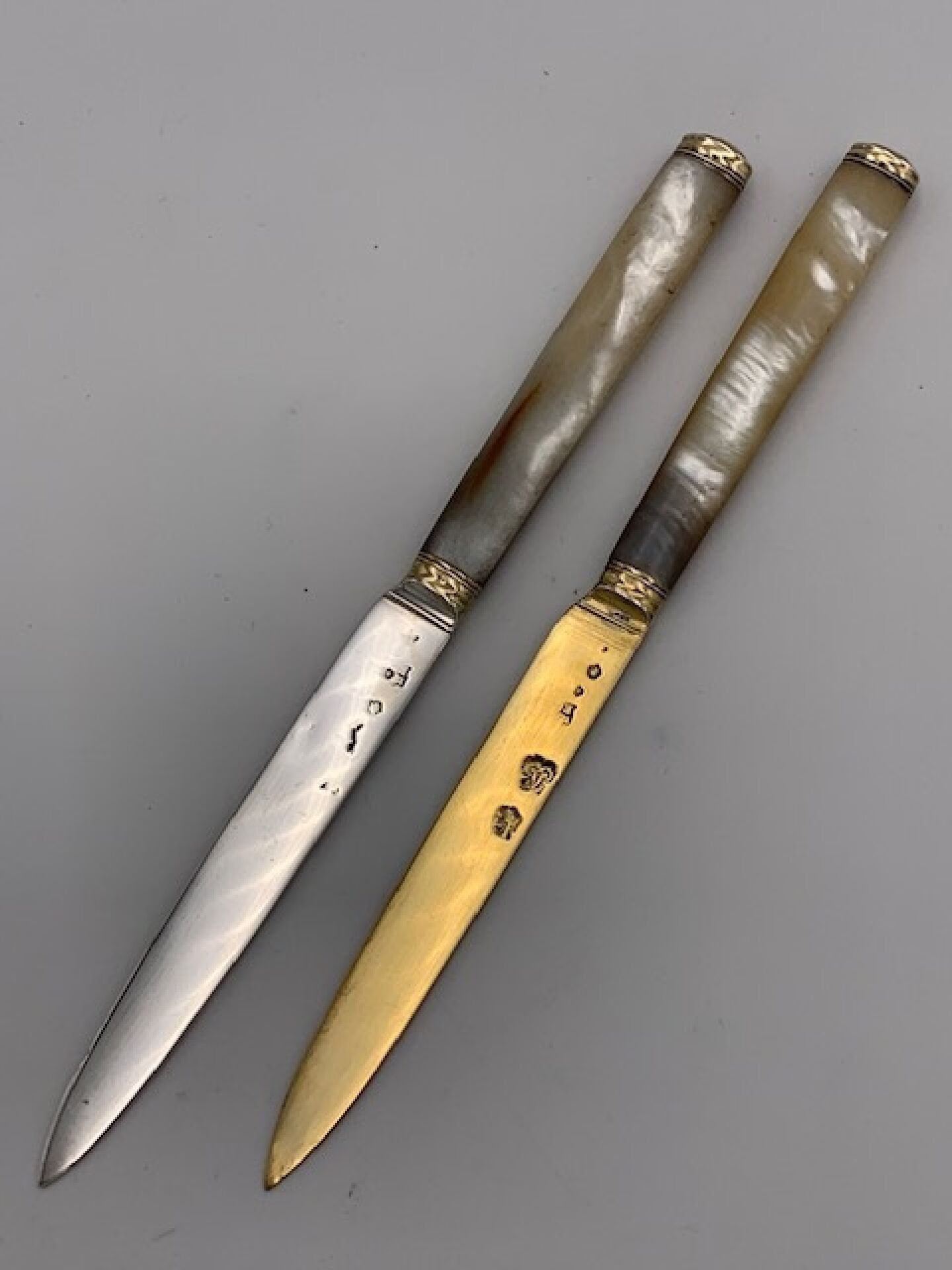 Pair of travel or kit knives, one with a silver blade, the other with a vermeil blade, the handles in polished mother-of-pearl. LOUIS XVI period. 18th century Fermiers Généraux hallmarks. PARIS 1782 (letter T). Cutler's hallmark. Length : 19,5cm. Weight : 70g