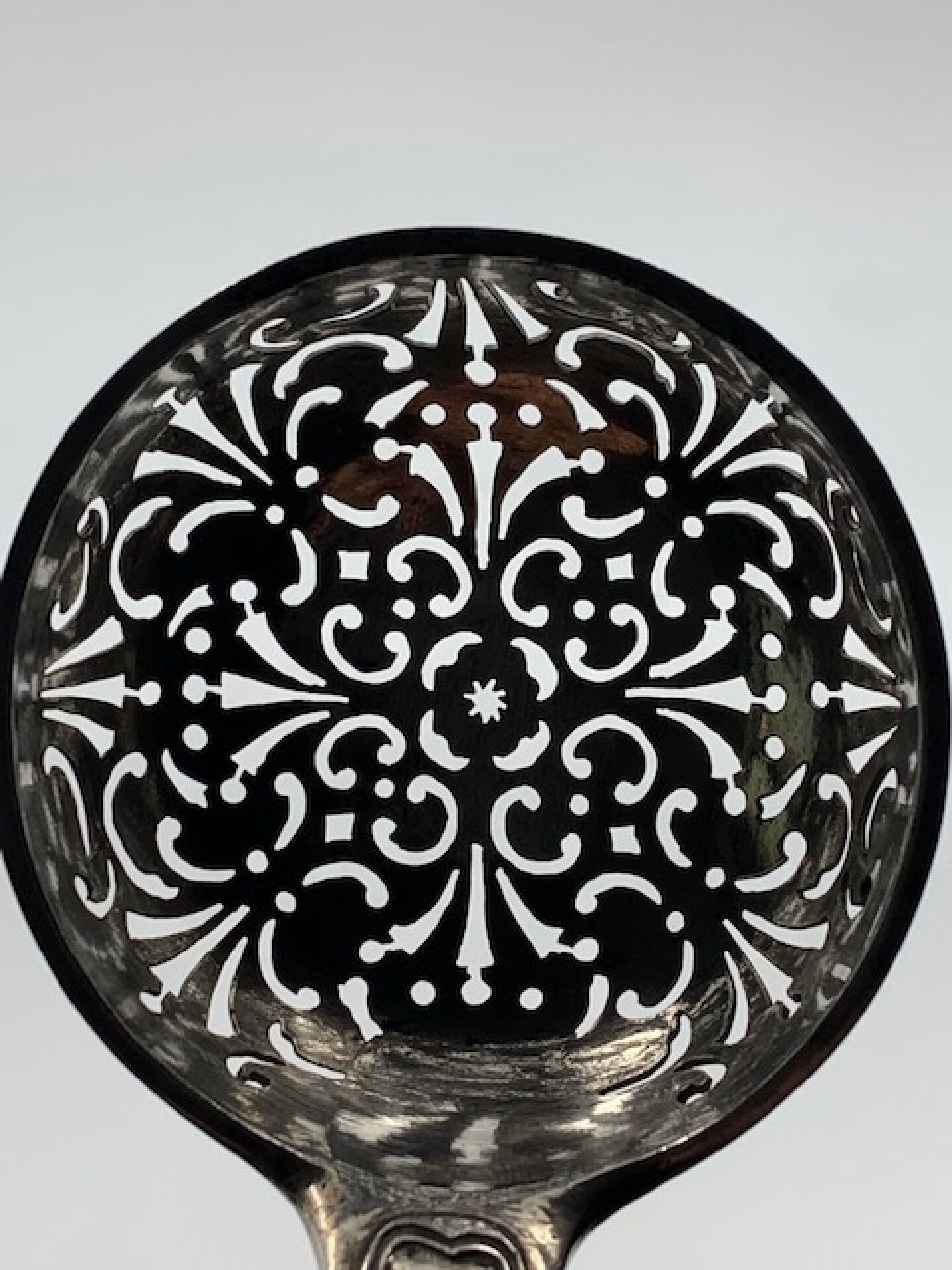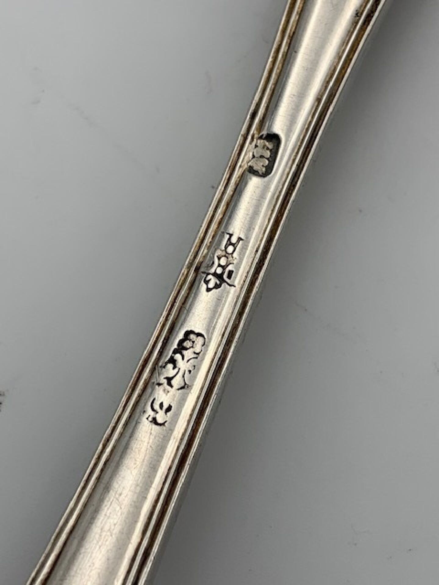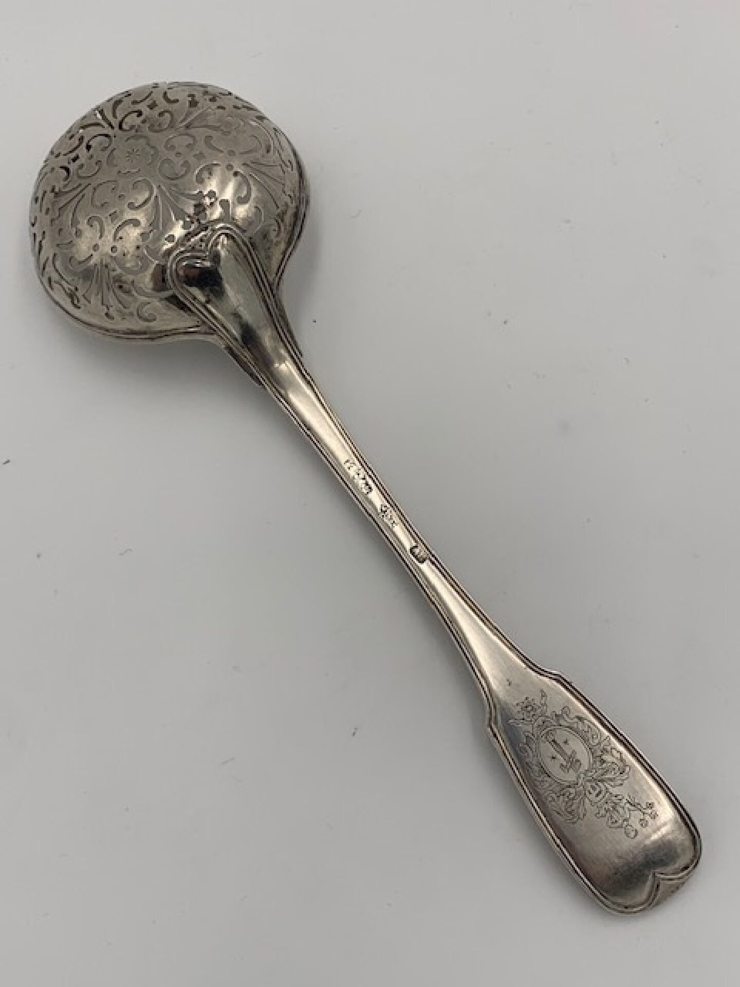 A silver sprinkling spoon. LOUIS XV period. 18th century Fermiers Généraux hallmarks (EASTERN France, COLMAR or MULHOUSE?). Spatula engraved with a coat of arms under a knight's helmet. Length : 21,3cm. Weight : 102g