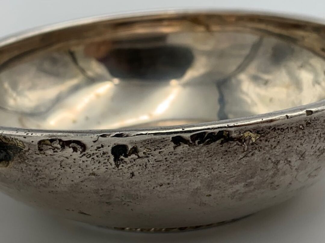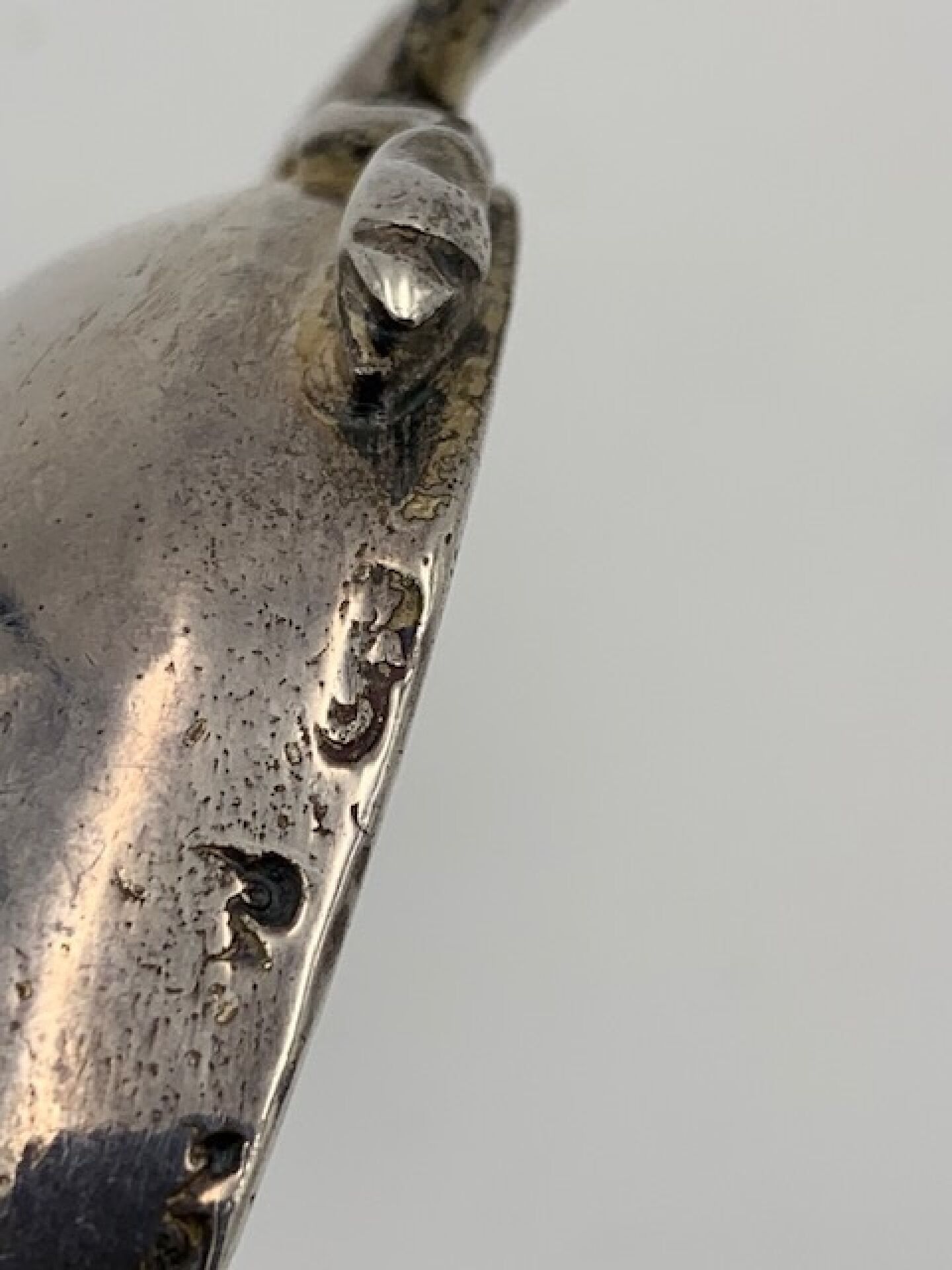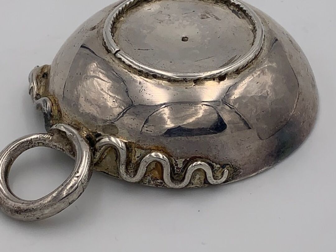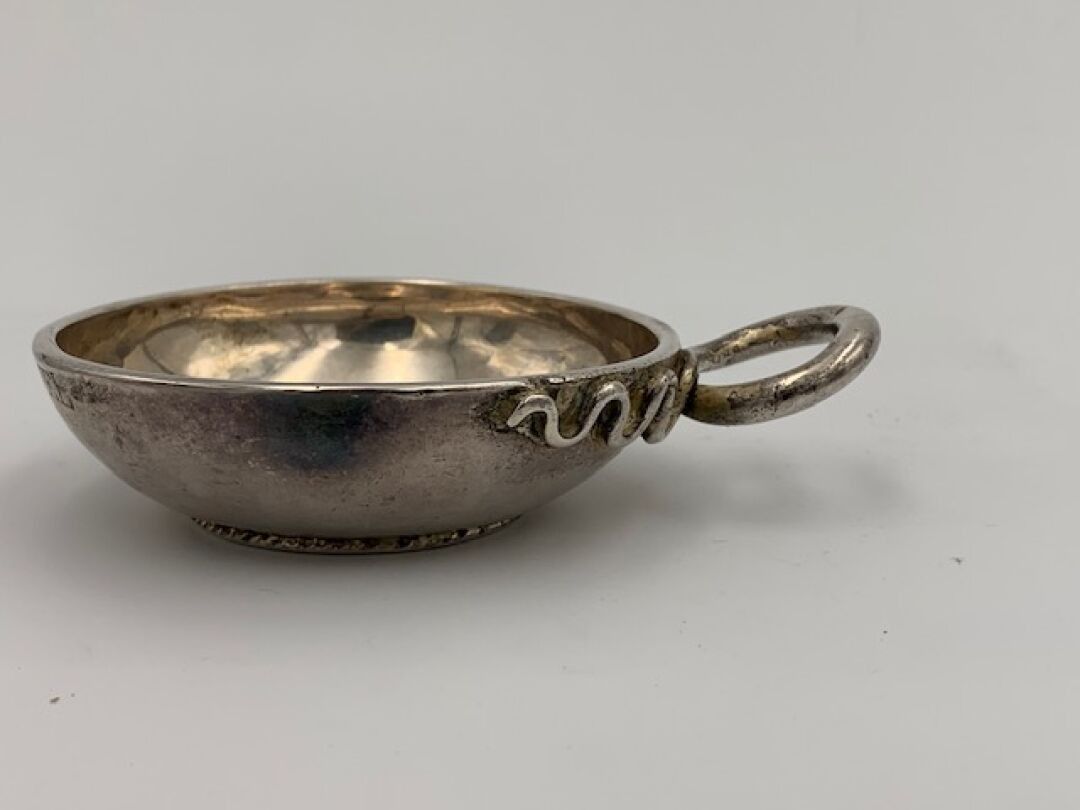 A plain silver wine stein with an entwined snake handle, standing on a small cordelière-shaped stick. Marked Fermiers Généraux VALLÉE DU RHONE 17th century. LYON 1756-1762. Hallmark of the master goldsmith Jérôme ALBERTON received in 1739. Weight: 112g. Goldsmith's hallmark reproduced in the book "L'orfèvrerie de Lyon et de Trévoux" page 112.