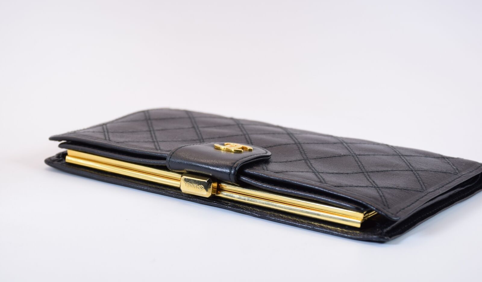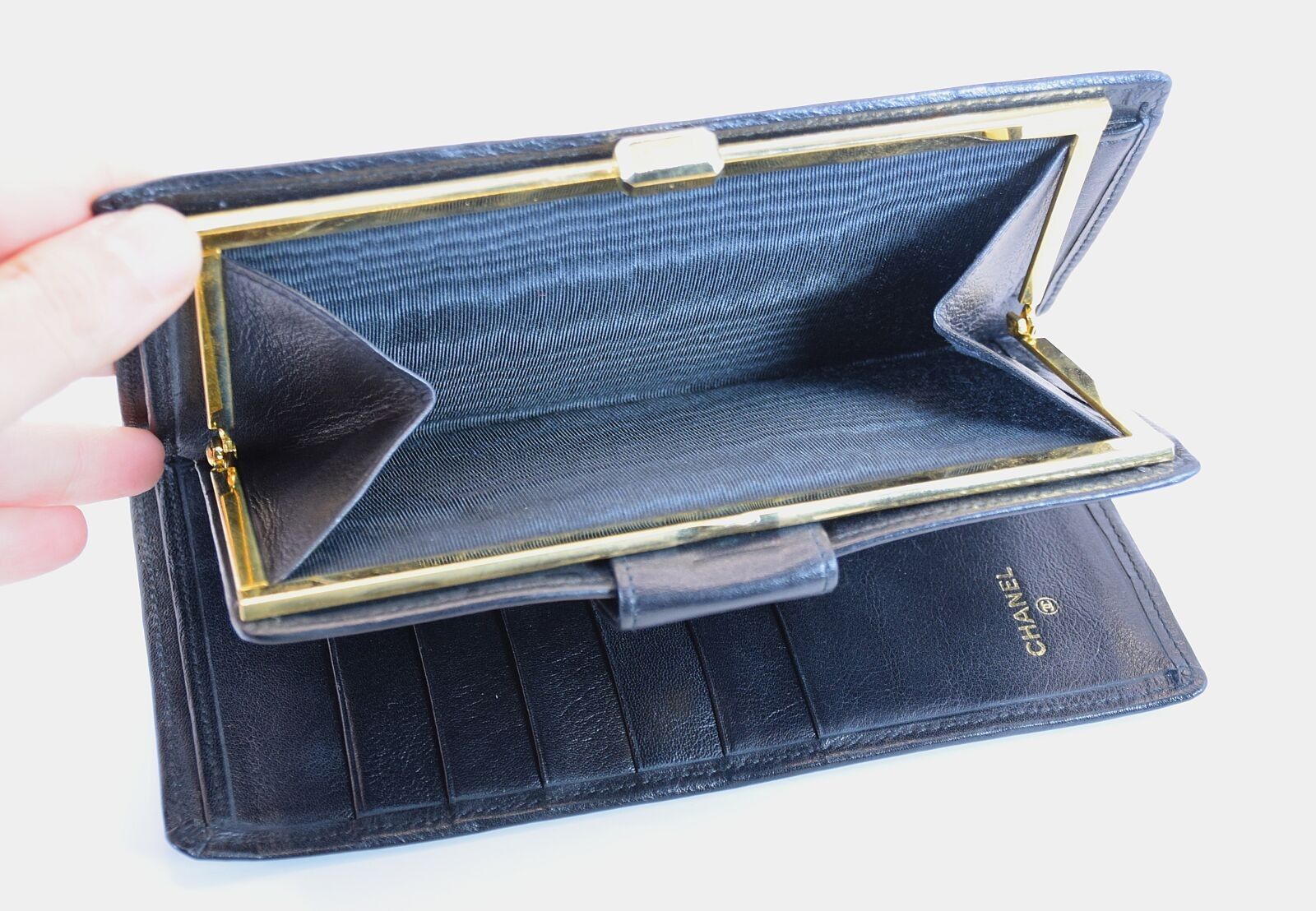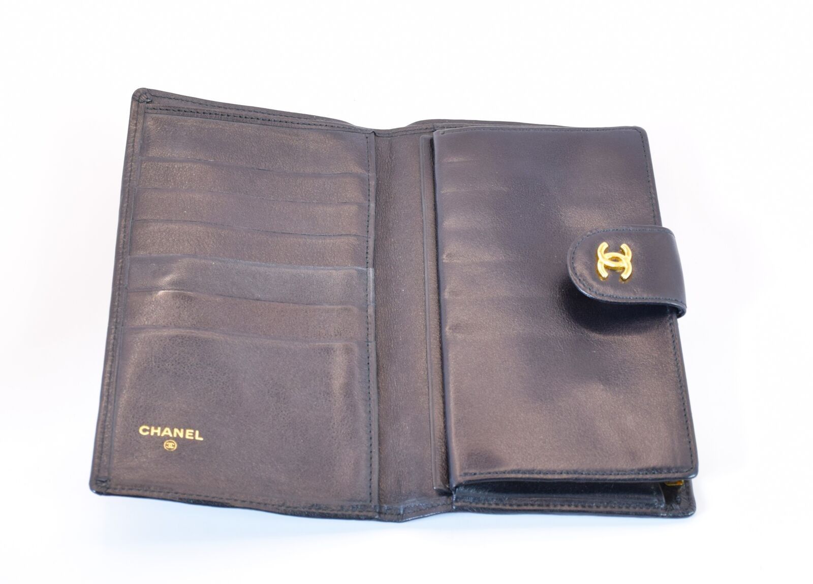 CHANEL - POCKET - MONEY HOLDER in quilted black lambskin leather, gold-plated CC logo press stud fastening revealing a leather interior with 6 card holders and 4 open pockets, fold-out coin purse at the back with Chanel-marked clip fastening. 17.5 x 10 cm. Perfect cosmetic condition.