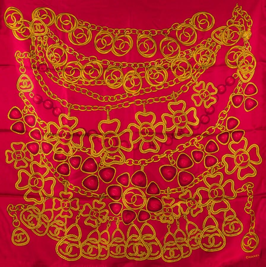 CHANEL - Silk FOULARD with red background decorated with gol…