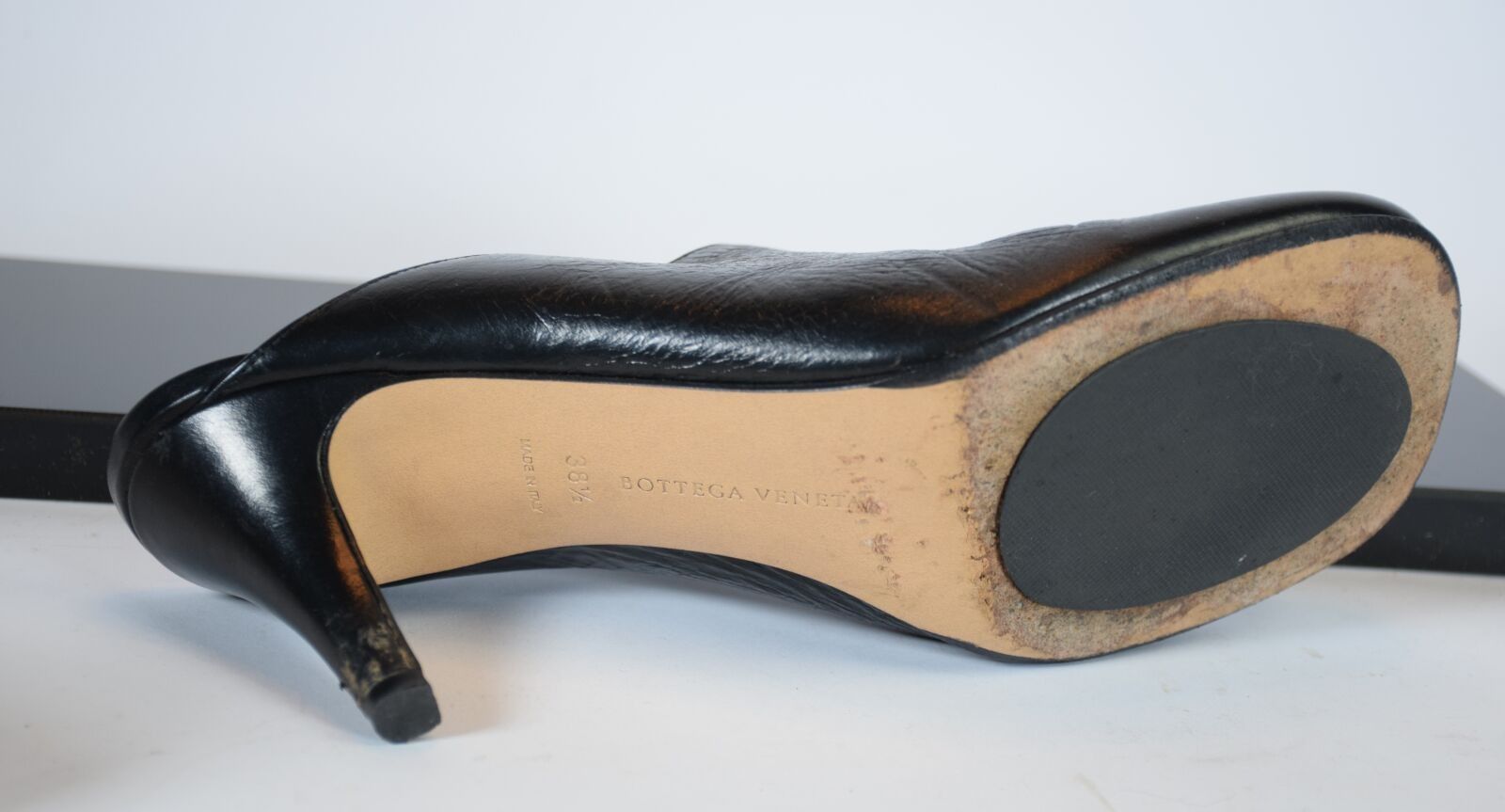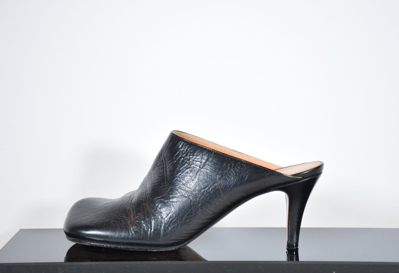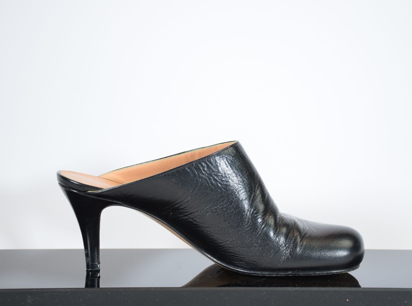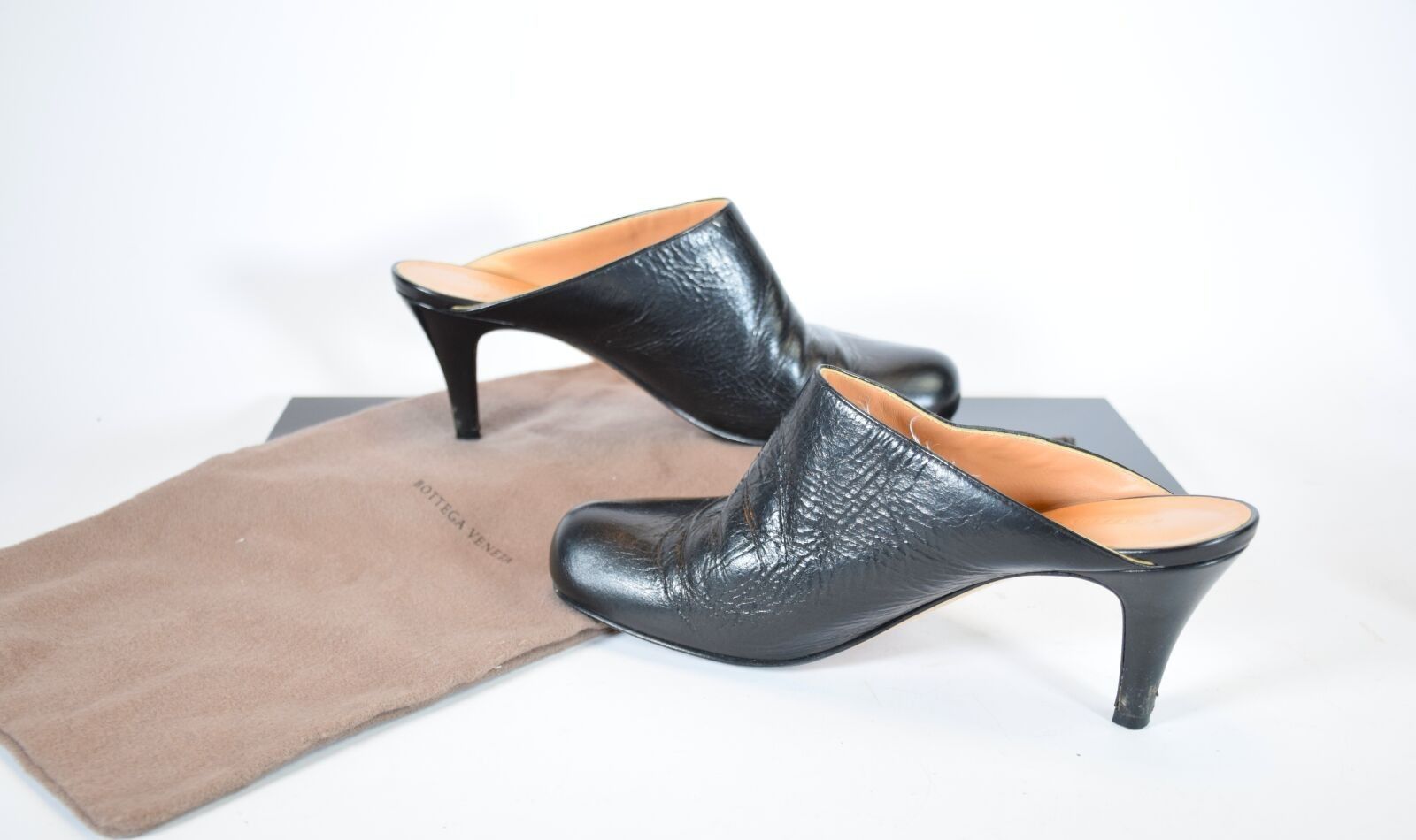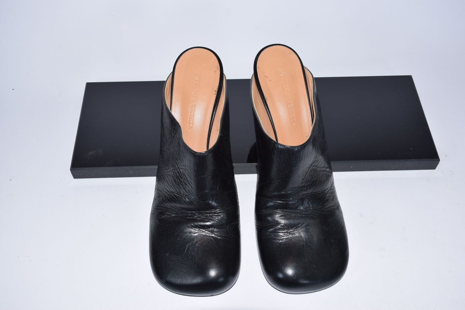 BOTTEGA VENETA - Pair of black leather heeled MULES. 38.5 (worn)