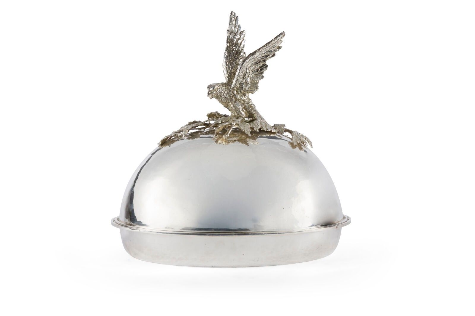 A silver plated oval serving dish, the lid richly decorated with a connected bird. Signed. Pyrex dish inside.