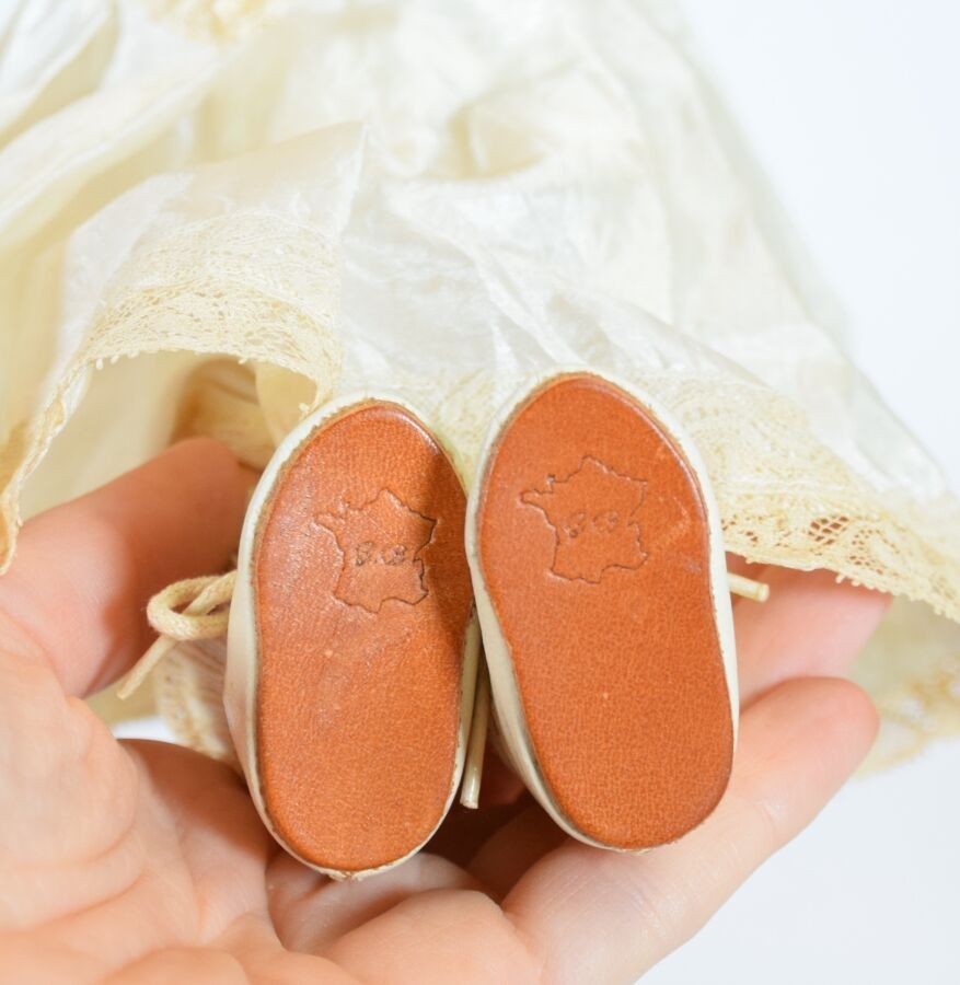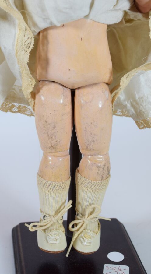 J. STEINER - PUPPY head in porcelain biscuit A6 mould mouth closed blue sulphur eyes fixed, pierced ears. Fully jointed composition body. Marked "J. STEINER / Bté SGDG / Paris / A6" on the neck. With dress, socks and shoes marked GB (for Georgette Bravo). Attached wig. Height 33 cm (one finger glued back)