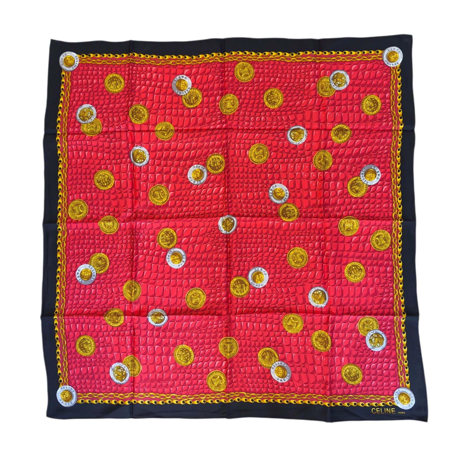 CELINE - Square FOULARD in polychrome silk twill decorated with coins on a red background. Pouch. Very good condition