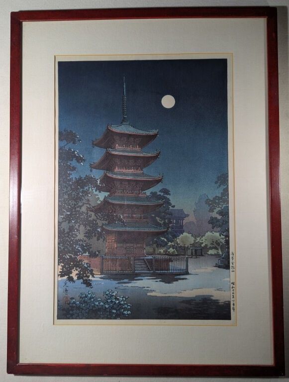 Tsuchiya KOITSU (1870-1949), Kinryusan Temple in Asakusa, print, size: 41.9x28.5 cm + frame: 54.6x40.6 cm, publisher: Doi Sadaichi. Posthumous print, produced in the 1960s using Koitsu's original plates, identical to the original edition except for the publisher's seal. Very good condition. Japanese artist and painter, belonging to the Shin-Hanga school, landscape artist in the tradition of Kiyochika and Kawase Hasui, based on a beautiful interpretation of light.