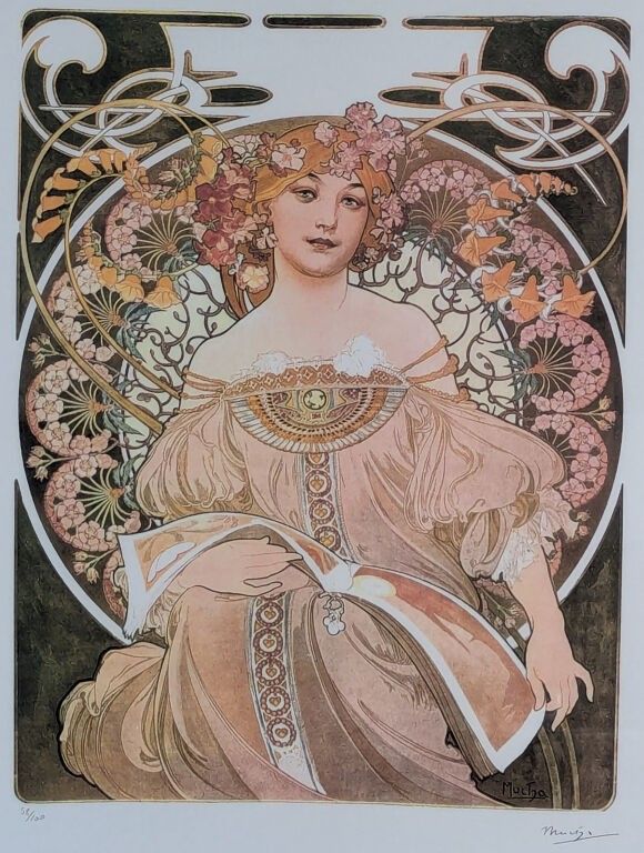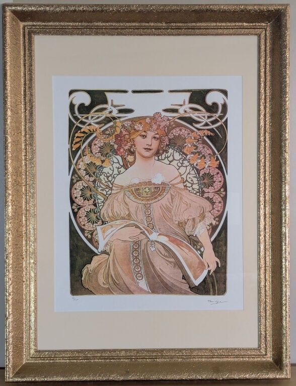 Alphonse Mucha (1860-1939) after , Rêverie, offset lithograph, numbered, signature printed in the plate, size: 70 x 50 cm + gilt frame 82x62 cm.