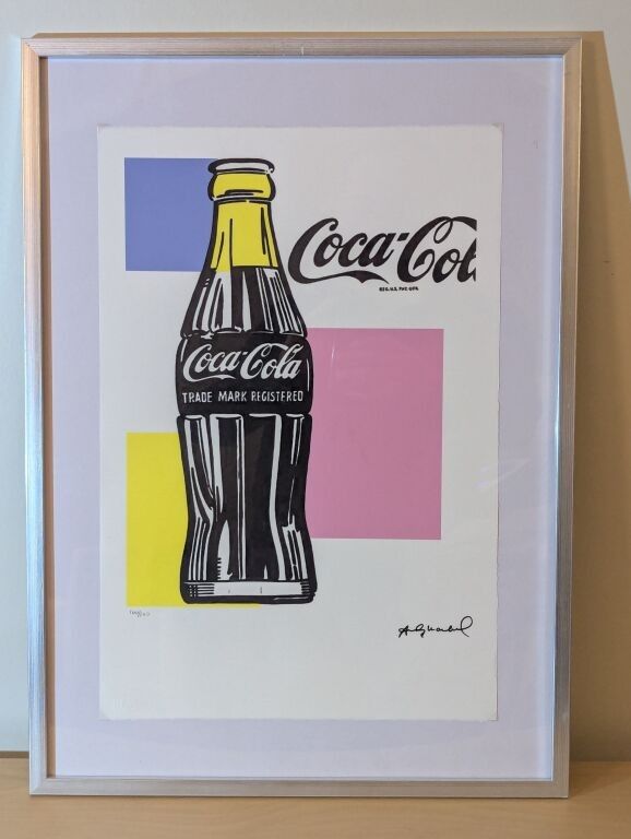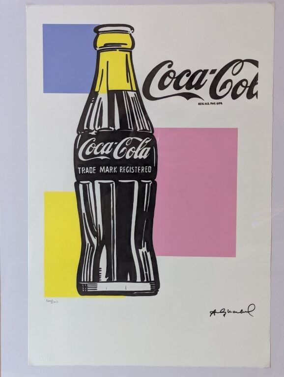 Andy Warhol (1928-1987) d'après, Coca Cola, offset lithograph in colours on Arches paper, numbered, limited edition of 100, 57 x 38 cm + frame, signature printed in the plate, dry stamp of the publisher Georges Israel. On the back, stamp: Art Gallery Leo Castelli New York, gallery open from 1957 to 1999 in New York. Andy Warhol Collection certificate enclosed with the sale,
