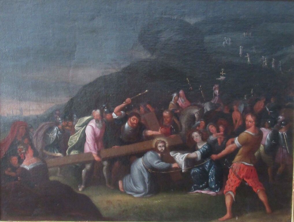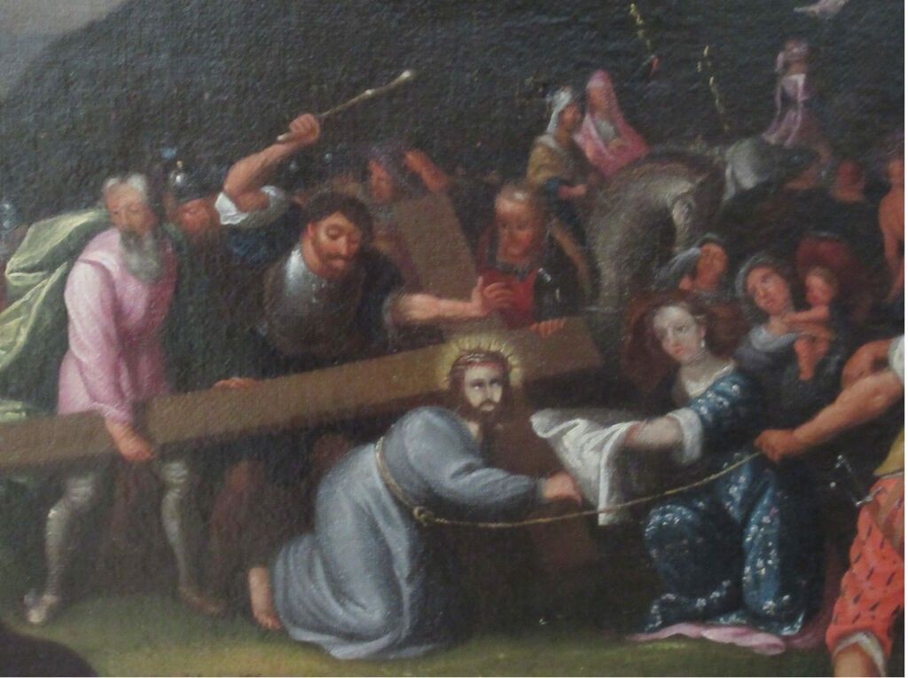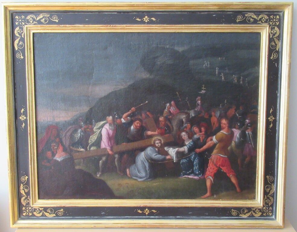 Flemish school from the 17th century, follower of Frans II FRANCKEN (1581-1642), Christ and Saint Veronica on the way to Calvary, oil on canvas, repainted, restorations, dimensions: 55x73 cm , gilded frame with a foliage decoration: 71x89 cm . Note: an accident (2 cm hole above the head of the central rider). Veronica is wiping the sweat from Christ's face, which has fallen under the weight of the cross during the ascent to Calvary, with a veil.