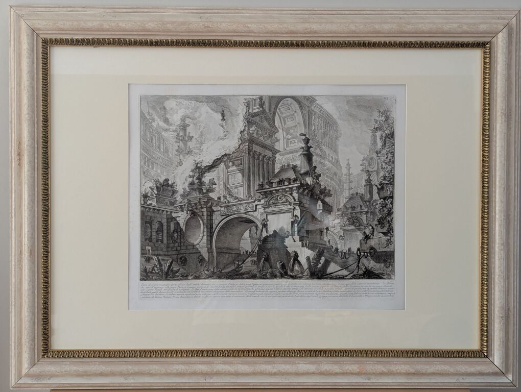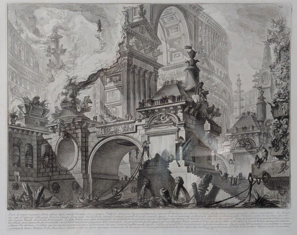 Giambattista PIRANESI (1720-1778) Part of a vast magnificent port for the use of the Romans 1751. Etching and burin, caption in Italian, dimensions at sight: 48x59,5 cm + frame: 81,5x110 cm . Proof on strong laid paper, fine condition, number 344. Italian archaeologist, architect and classical artist, famous for his engravings of Rome, Italy, and of fictitious and atmospheric "prisons". Translation of caption: Part of a great and magnificent Seaport of the ancient Romans, according to a project. The interior of the great Piazza del Mercato is adorned with rostral columns marking the naval victories of the ancient Romans. The two large towers served as lanterns, which were lit to ensure the safety of sailors. The statues, inscriptions and all the ornaments of this port are taken from the remains of ancient monuments scattered throughout the Roman countryside and beyond.