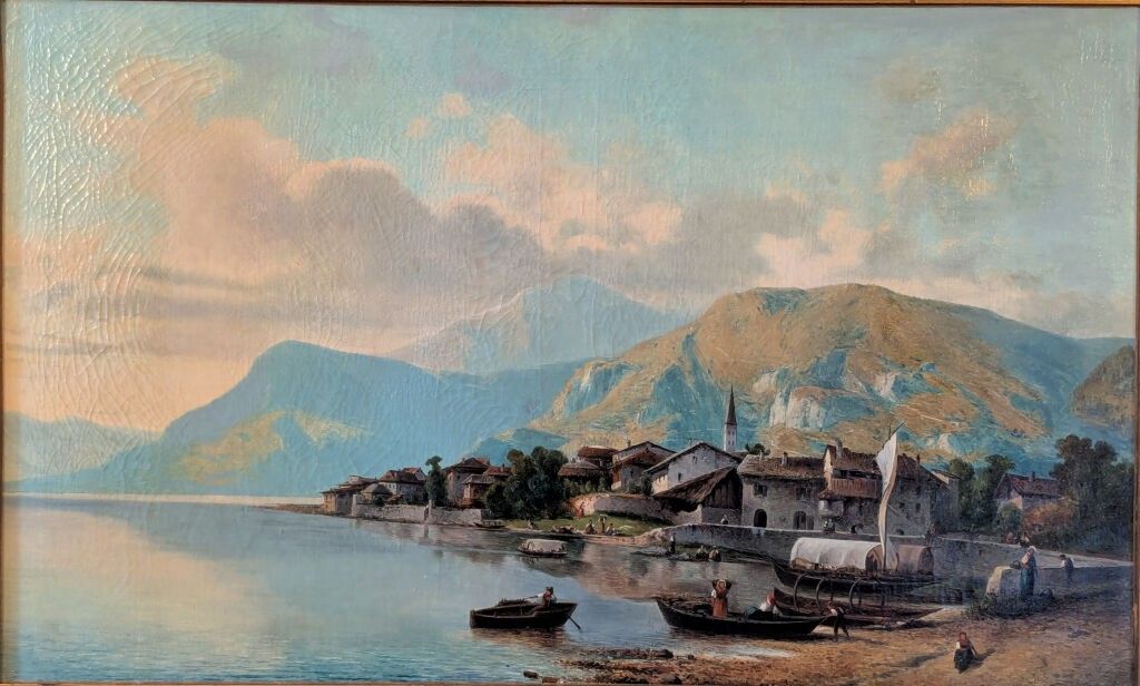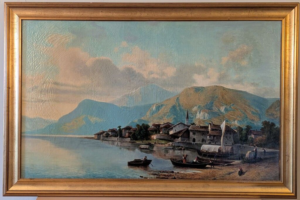 Ercole Calvi ( 1824 - 1900), attributed to, View of Omegna, Lake Orta, Italy, circa 1870, oil on canvas , size : 64,5x104 cm + frame 79x118 cm, good condition, restorations.