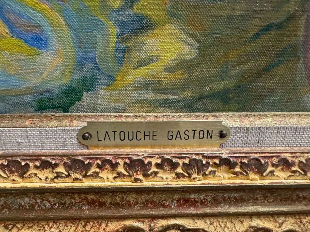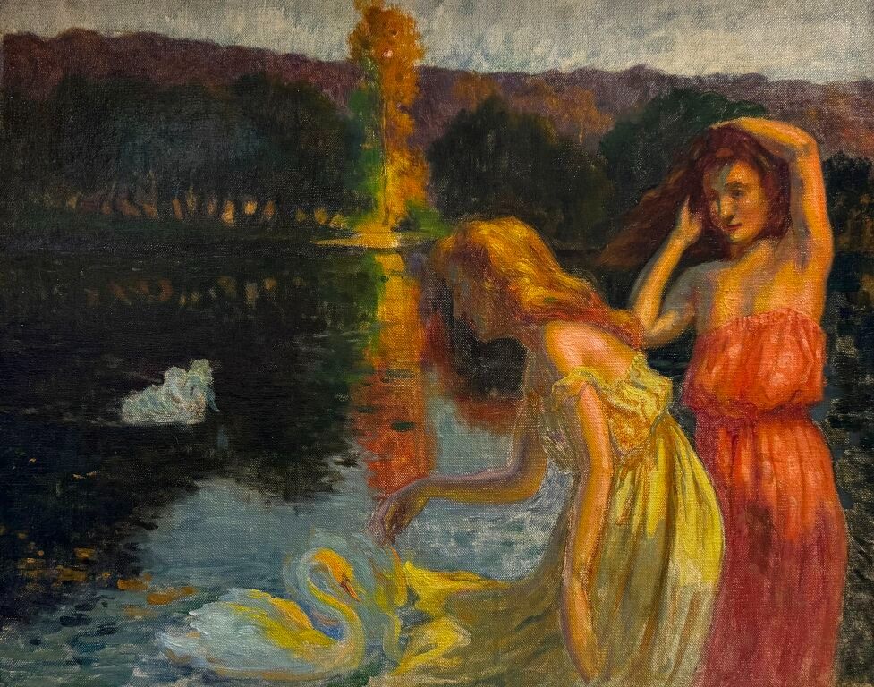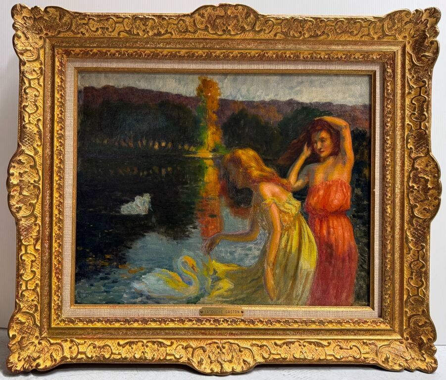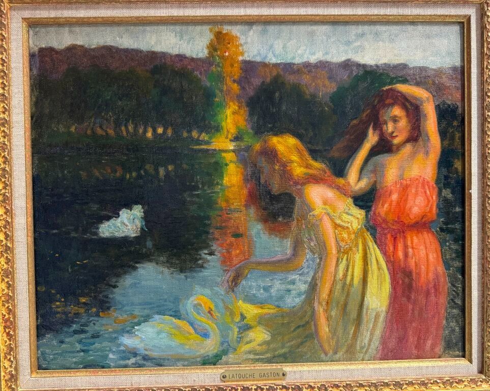 LATOUCHE Gaston, 1854-1913 in the style of , Femmes au bord d'un lac, oil on canvas (restorations), unsigned, on the back of the canvas an inscription: G Latouche 97, 32.5 x 41 cm.