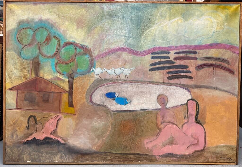 Tomaso POMENTALE born in 1932. Animated landscape. HSToile. Signed. 89 x 130 cm.