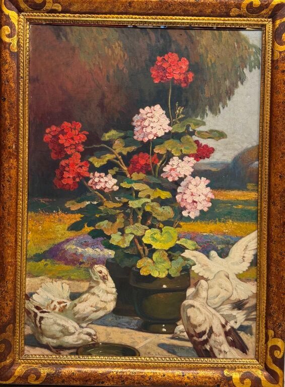 Victor L'homme 1870-1957. Still life with flowers and pigeons. Oil on canvas. Signed. 92 x 65,5 cm.