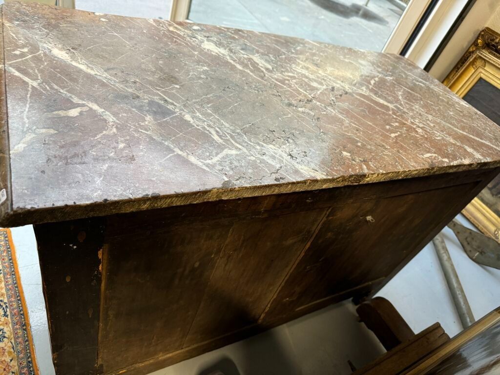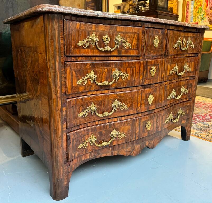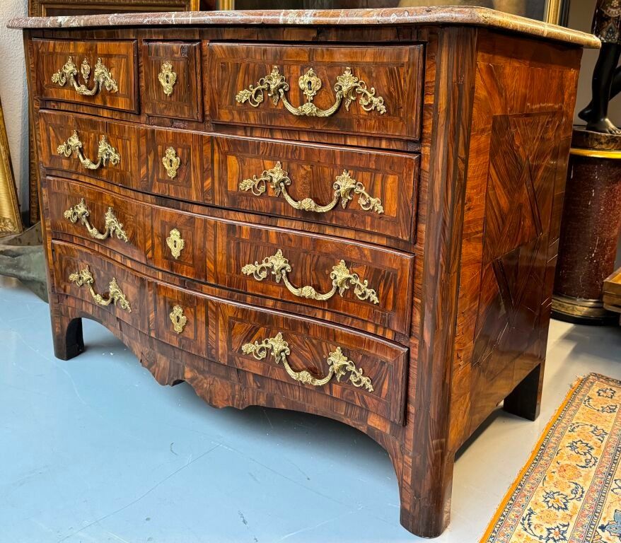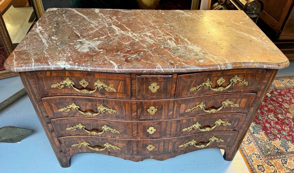 Veneered curved chest of drawers. 6 drawers. Marble top. 18th century. L. 129 cm.