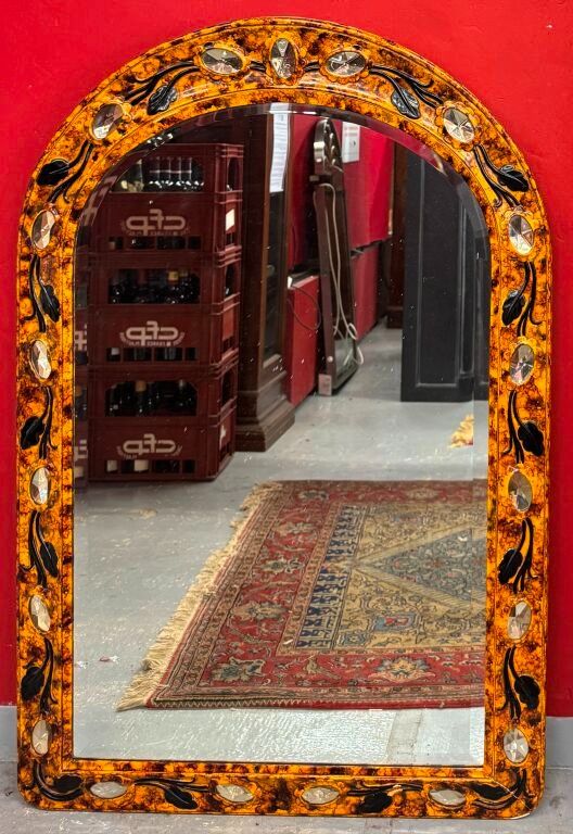 Bevelled mirror with floral resin frame and faceted inserts. 120 x 80 cm.