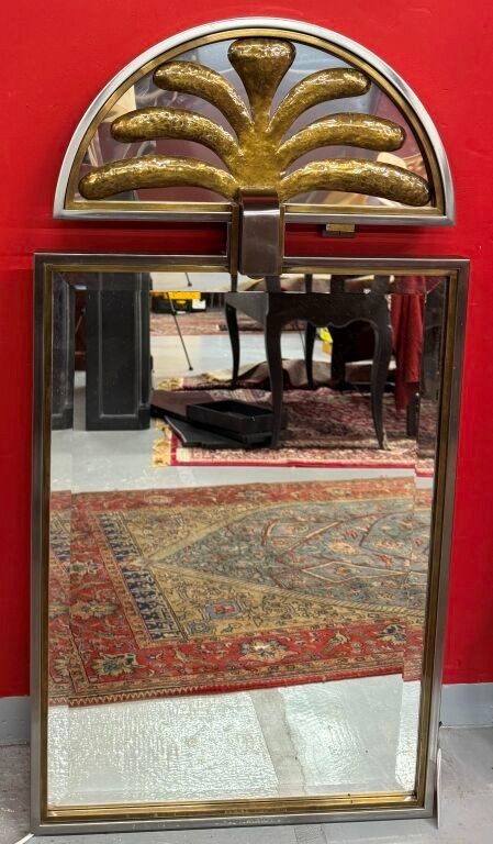 Maison Banci. Brushed metal bevelled mirror with pediment decorated with a stylised spray of embossed brass. 120 x 60 cm.