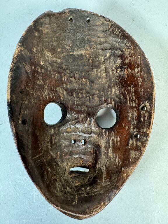 DAN mask known as a DEAN'GLE mask because of its soft appearance. Mask covered in a traditional black pigment, with circular gaping eyes showing the wearer's piercing vision.