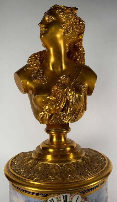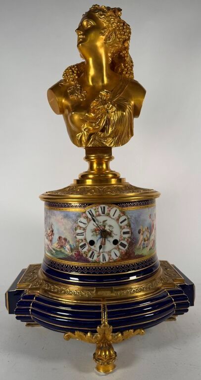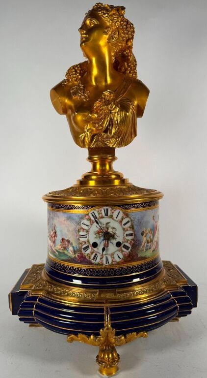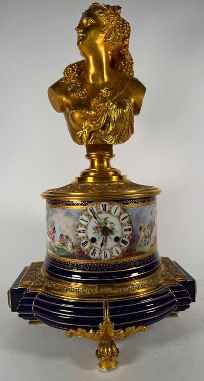 Bust of a Bacchante, very similar to the Lady of the Roses, kept at Orsay; surmounted by a circular polychrome painted porcelain case. The whole rests on a bronze and porcelain base with a cobalt blue background underlined by wide gold fillets, in the Sèvres style.