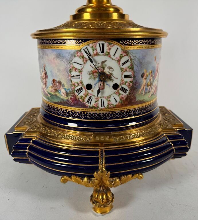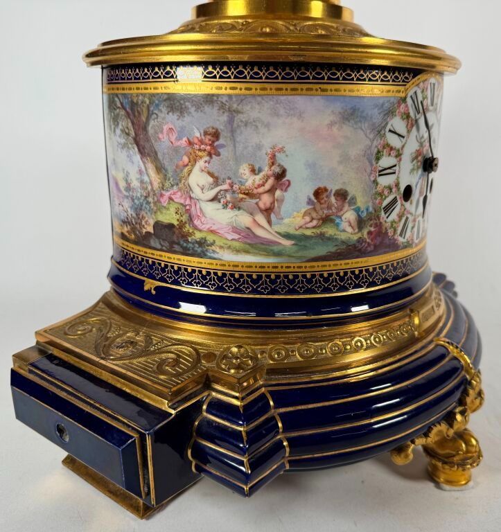 Porcelain band with rotating decoration, placed on either side of the dial. On one side, a Venus (?) with roses and on the other, a Bacchante crowned with roses, in a country landscape animated by putti.
