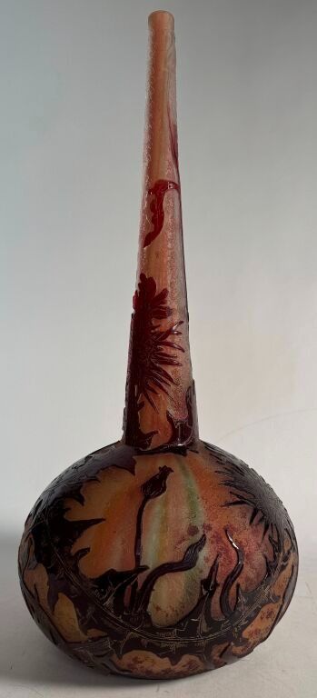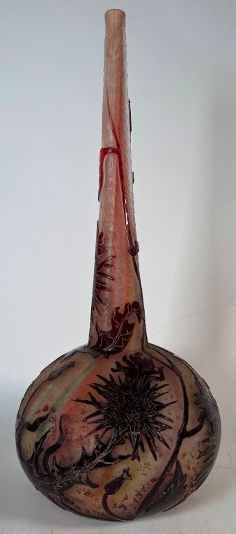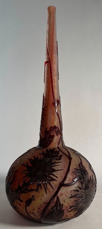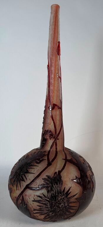 Daum Nancy. Soliflore vase in multi-layered crystal decorated with thistles engraved in relief with acid. Enhanced with gold. Signed below. Height: 43 cm.