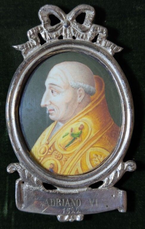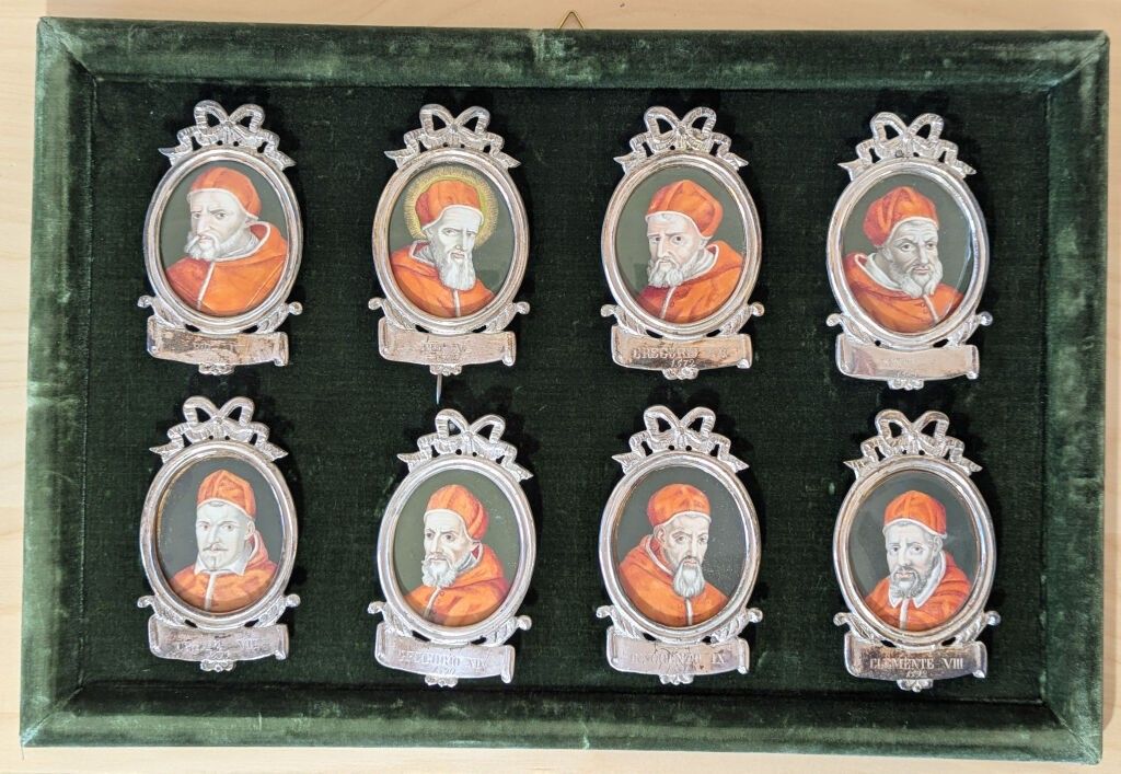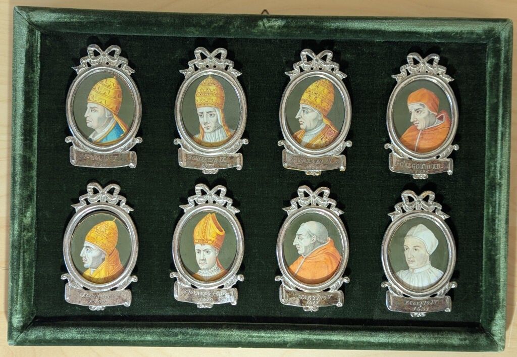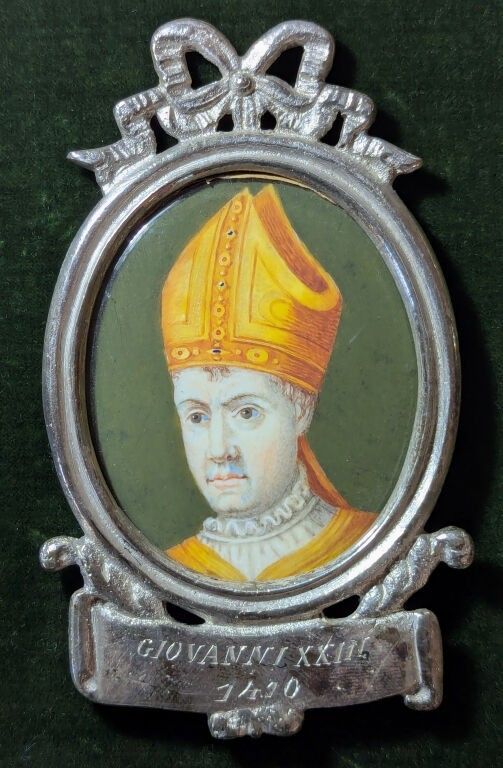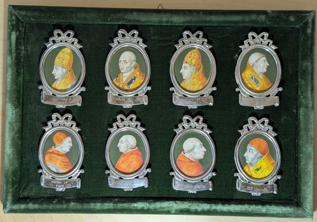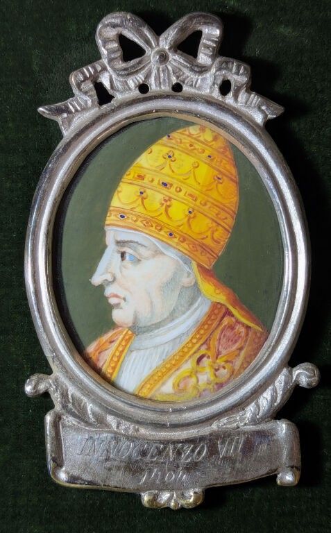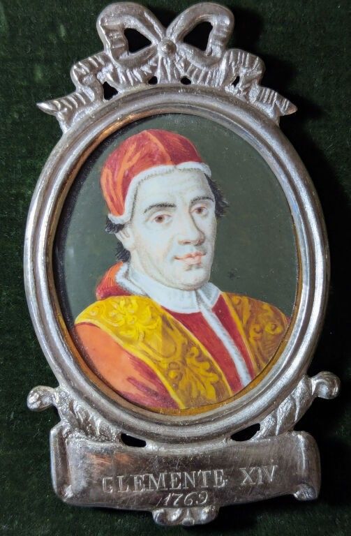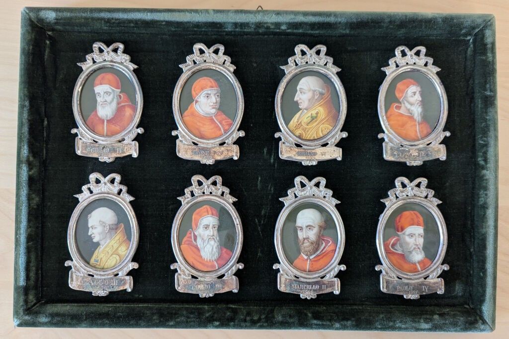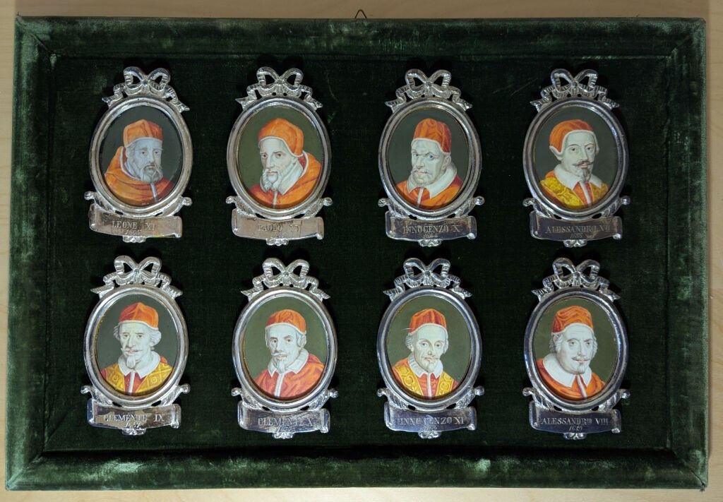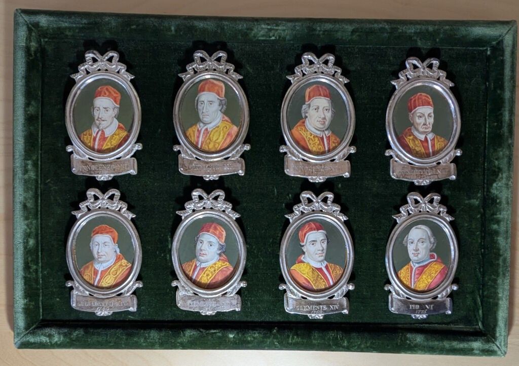 Italian school circa 1780, Exceptional suite of 48 oval miniatures, portraits of the popes, painted watercolour on bone 6x5cm. Solid silver medallions, 40 grams each, 10.5x6 cm, chased and decorated with a ribbon bow, foliage and the names of the popes and the date of the beginning of their reign, inscribed in Italian on a plate in the form of unrolled parchment. The medallions are presented in groups of eight, on six wooden trays covered in modern green velvet. The following popes are represented, covering the period between 1378 and 1775: Pius VI, Clement XIV, Clement XIII, Benedict XIV, Clement XII, Innocent XIII, Clement XI, Innocent XII, Alexander VIII, Innocent XI, Clement X, Clement IX, Alexander VII, Innocent X, Paul V, Leo XI, Clement VIII, Innocent IX, Gregory XIV, Urban VII, Sixtus V, Gregory XIII, Pius V, Paul IV, Marcel II, Julius III, Paul III, Clement VII, Adrian VI, Leo X, Julius II, Pius III, Alexander VI, Innocent VIII, Sixtus IV, Paul II, Pius II, Calixtus III, Nicholas V, Felix V, Martin V, John XXIII, Alexander V, Gregory XII, Innocent VII, Boniface IX, Urban VI,