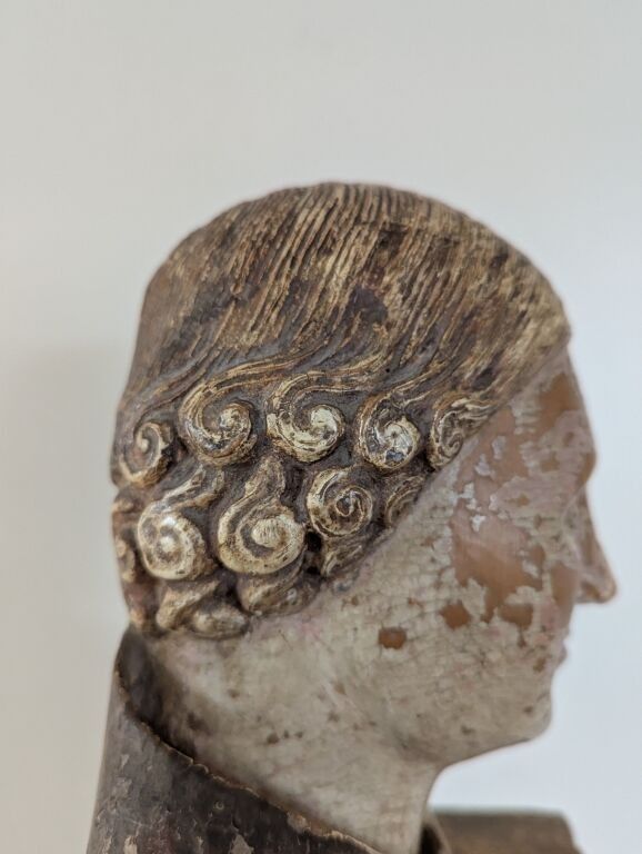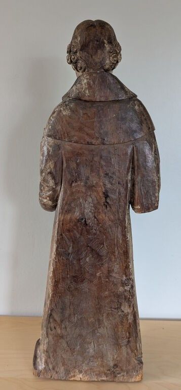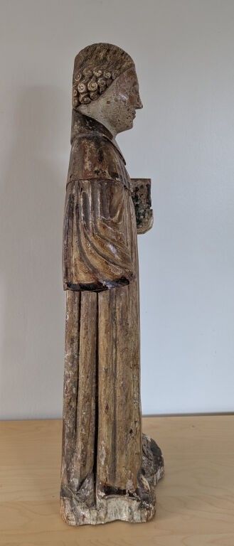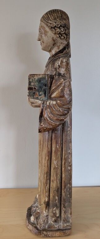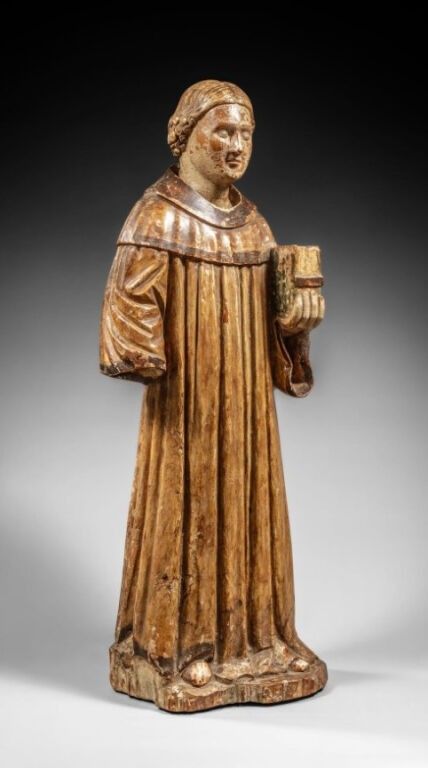 ITALY, circa 1400 - Saint Abbot in carved and polychromed softwood, rough back. Standing, he holds a closed book in his left hand; full face, almond-shaped eyes with hemmed eyelids; beautiful hair divided by a median parting forming curls on the sides. Savoy, Val d'Aoste, circa 1400 , Height: 88 cm - Width: 30 cm - Depth: 20 cm, (some missing, including the right forearm) . Book consulted: E. Rossetti Brezzi, La scultura dipinta, OEuvres d'art sacré dans les Etats de Savoie 1200-1500, Quart, 2004.