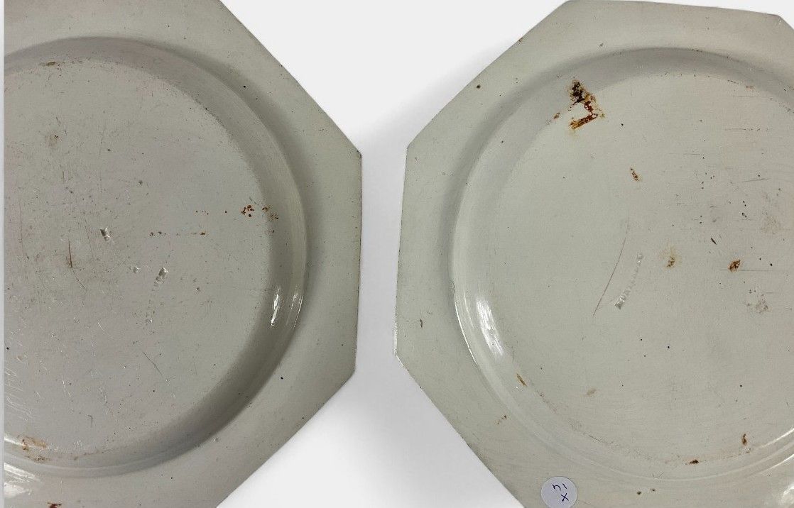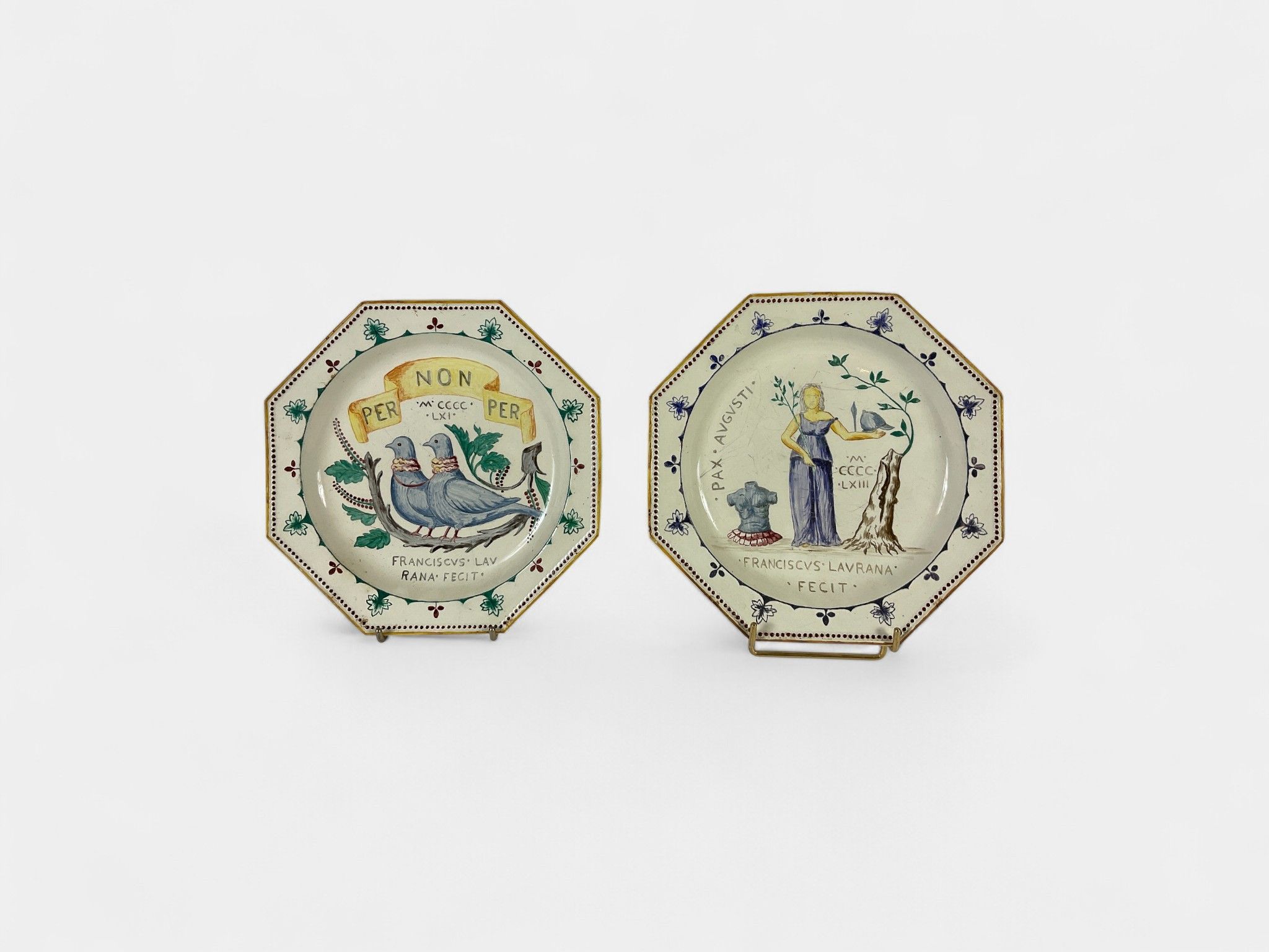 19th century Montereau earthenware Set of two "Per. No. Per." and "Pax August" in polychrome earthenware, inscribed "Franciscus Laurana Fecit" and decorated with doves and figures in the Antique style, surrounded by borders, dots, shamrocks and oak leaves; Debossed mark (Small imperfections, small scratches).